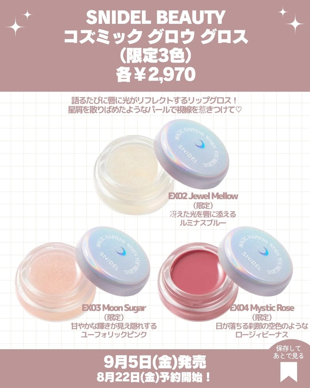 .SNIDELBEAUTYから2年ぶりにMoonMagicコレクションが登場👏人気アイテムが幻想的な限定カラーでお目見え✨️9月5日発売❤8月22日予約開始・アイデザイナーn《限定1色》6600円・ユーフォリックグロウブラッシュ《限定3色》3300円・コズミックグロウグロス《限定3色》2970円・ダズリングラッシュマスカラ《限定2色》2970円#秋の新作コスメ#新作コスメ#コスメ紹介#SNIDEL#SNIDELBEAUTY#MoonMagicコレクション#アイシャドウパレット#チーク#リップグロス#カラーマスカラ