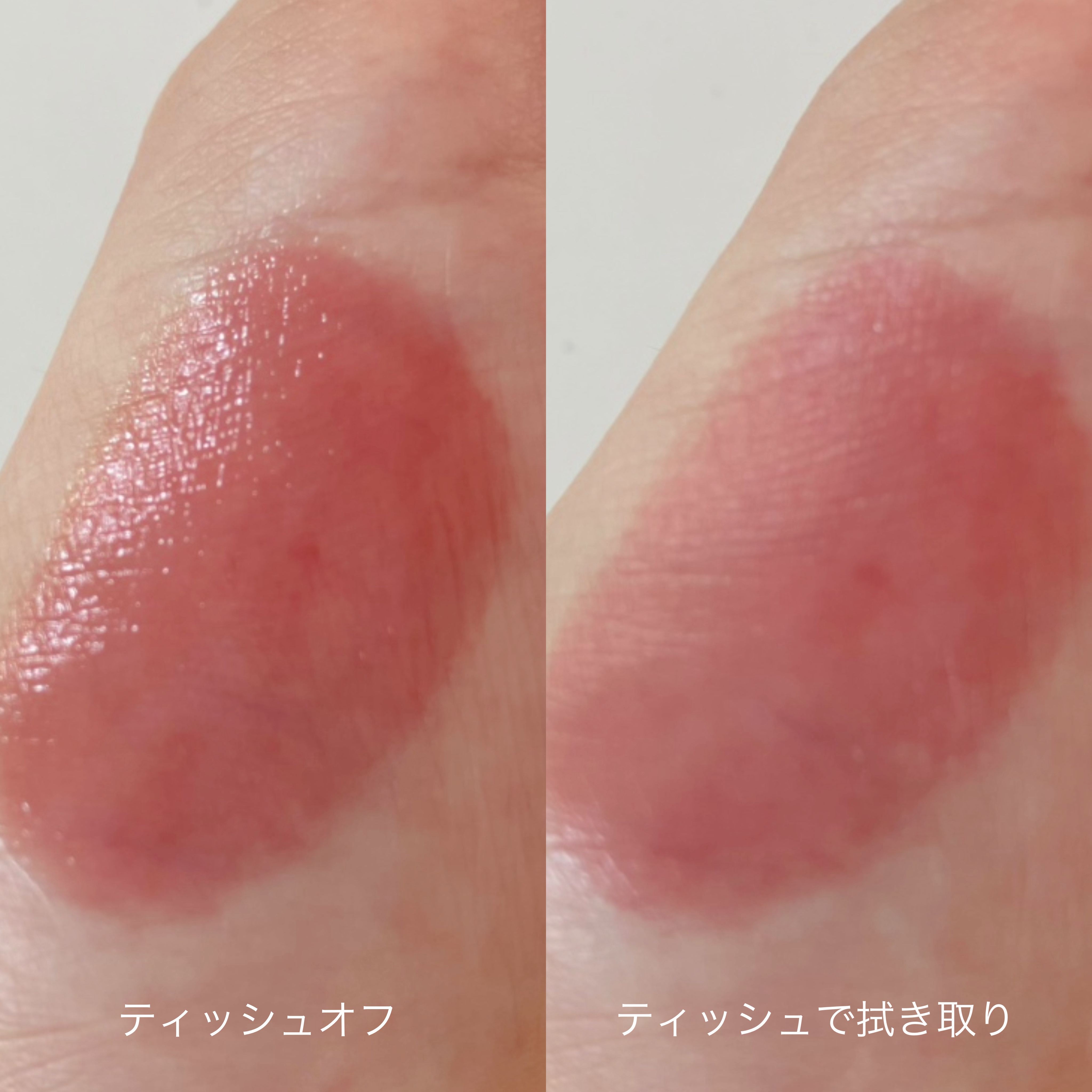 ロウグロウジェルティント(hince)税込1,760円(内容量4ml)✦実際に使って見た感想✦✏︎ブルベでも浮かないモーブローズ黄みの少ないくすみローズカラーで、秋っぽいブラウンが苦手なブルベの方でも自然に馴染む色味。大人っぽさと華やかさの両方を演出できます。ツヤ感・透け感・発色のバランスが絶妙で普段使いしやすいのに、しっかり洒落感が出るのが魅力です。✏︎ティント力が強く落ちにくい写真は塗布した直後と5分後に拭き取った際のものです。実際に食事をしても問題なく色が残るほどの高いティント力。ツヤ感は少しずつ落ち着きますが、ベースカラーがしっかり残るので、長時間の外出でも安心でした。✏︎乾燥が気にならない使用感ティントは乾燥しやすいイメージがありますが、こちらはしっとりとした保湿感が続きます。時間が経ってもパサつかず、快適に使えました。