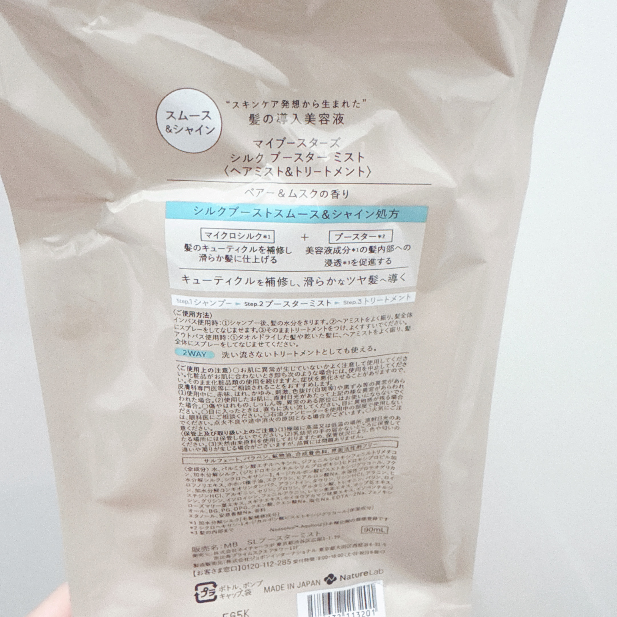 美容院みたいな方法でケアするタイプのインバスアイテムです。(シャンプー→髪にミスト→トリートメントの3ステップ)マイブースターズのシリーズ通り、インシルクシリーズはダメージ用に感じたため、毎日使いではなく週に数回のスペシャルケアとして使用する...