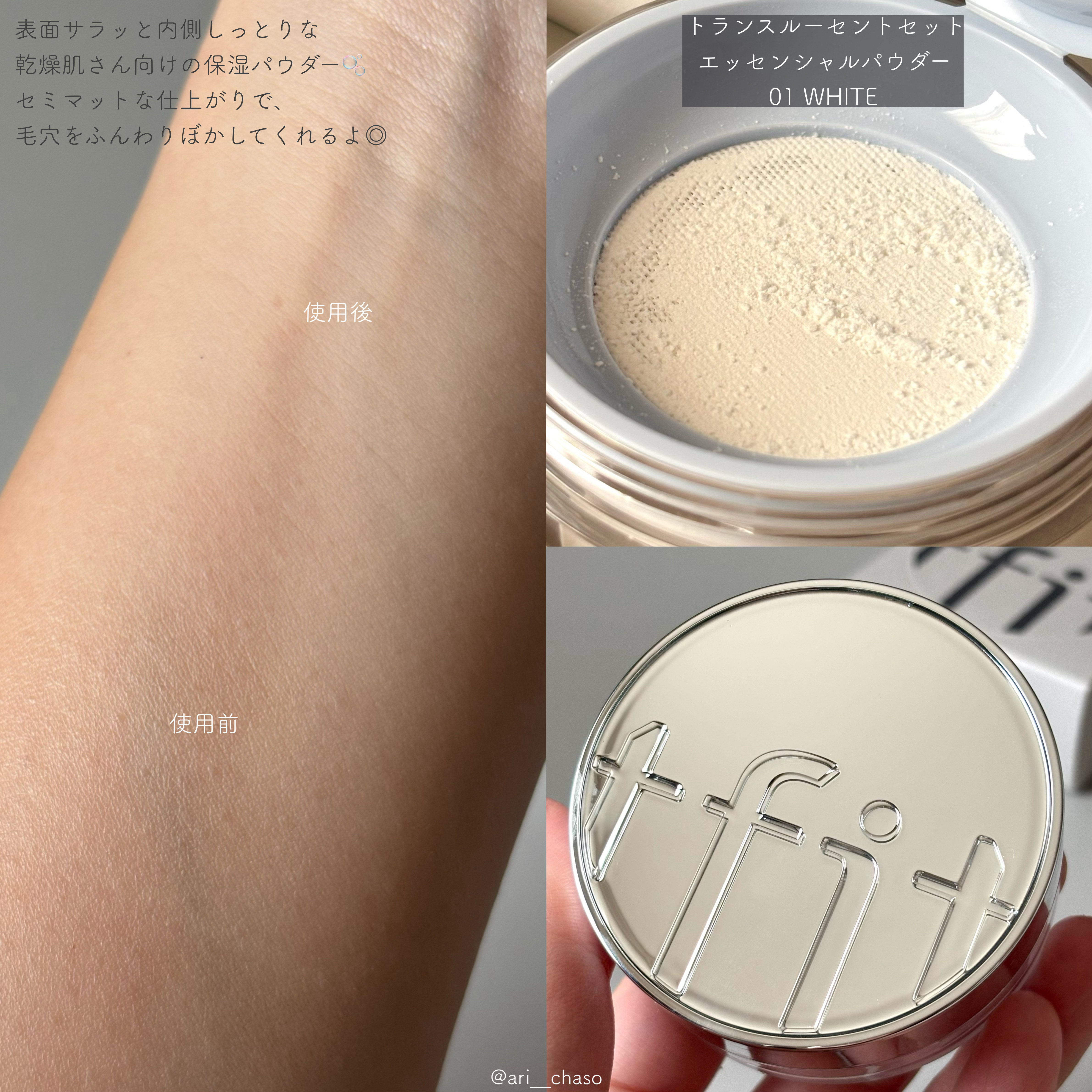 🩵tfitトランスルーセントセットエッセンシャルパウダー01Whiteをお試ししました✨正直、パウダー=乾燥するってイメージが強かったんだけど… これは乾燥肌向けの保湿パウダーって言われてるの納得🥺表面さらっと・内側のうるおいキープな仕上がり...