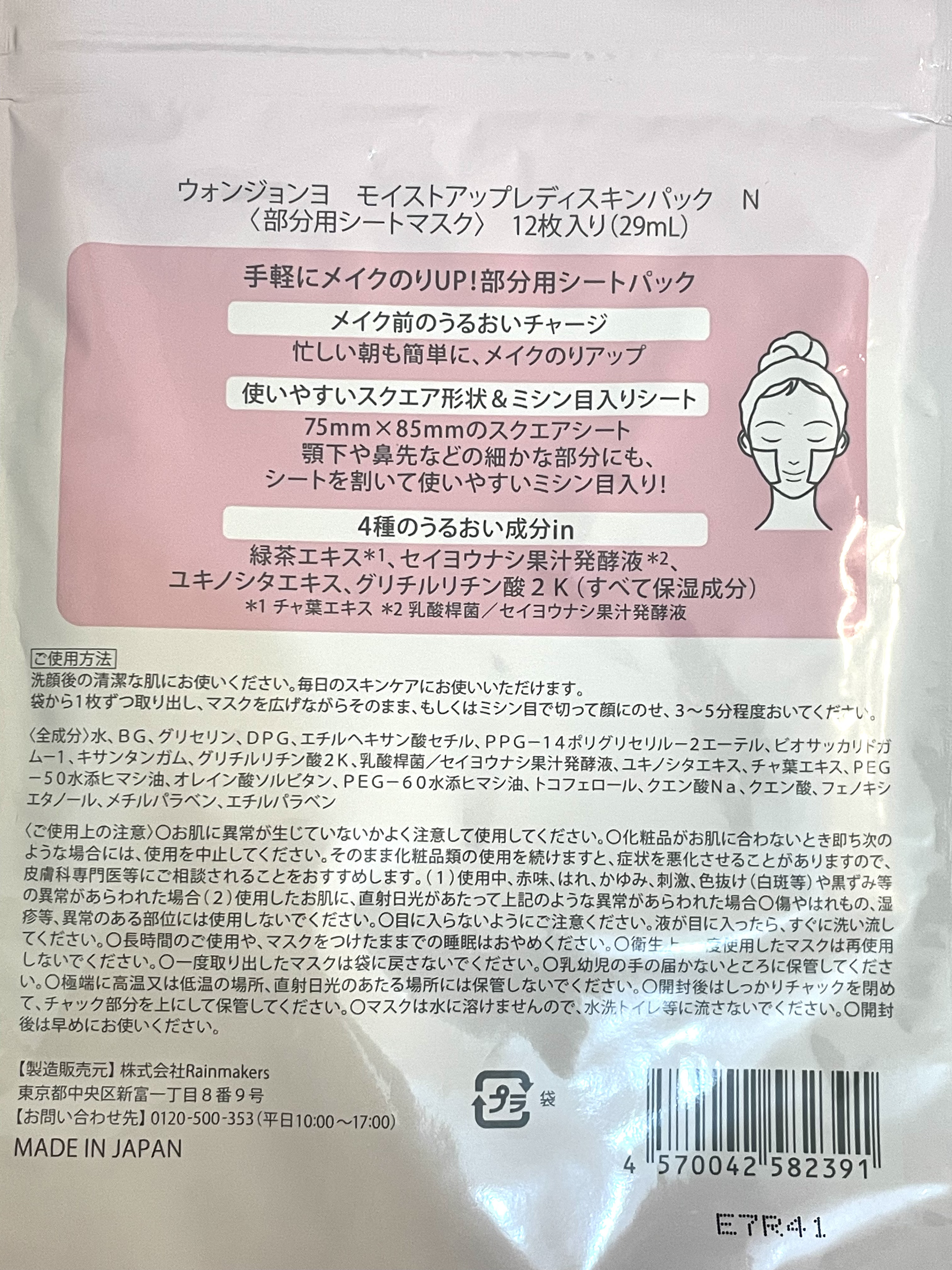 - 手軽にメイクのりUP!部分用シートパック ・メイク前のうるおいチャージ 忙しい朝も簡単に、メイクのリアップ ・使いやすいスクエア形状 75mm×85mmのスクエア型シート ハンドパックや首パックにもオススメ! ・4種のうるおい成分in(すべて保湿成分) *1緑茶エキス/*2セイヨウナシ果汁発酵液/ユキノシタエキス/グリチルリチン酸2K *1チャ葉エキス *2乳酸桿菌/セイヨウナシ果汁発酵液 ミシン目入りになってリニューアル発売 ※2025年8月18日、29日〜順次リニューアル リニューアルに伴い商品名を「ウォンジョンヨ モイストアップレディスキンパック」から「ウォンジョンヨ モイストアップレディスキンパック N」へ変更しました。 【発売日】 <50枚入り> 8月18日(月)より全国のバラエティショップにて順次発売開始 ※公式オンラインストア、楽天、Qoo10、Amazonは順次切り替え予定 <12枚入り/10枚入り> 8月18日(月)よりロフトにて順次発売開始(モイストアップレディスキンパック・モイストアップレディスキンパック DMのみ) 8月29日(金)より全国のバラエティショップ・公式オンラインストアにて発売開始 【取扱店】ウォンジョンヨ公式オンラインストア、Amazon、Qoo10、楽天、アインズ&トルペ、アットコスメ、R.O.U、イオン、京王アートマン、ショップイン、チャーリー、ハンズ、マツモトキヨシ、プラザ、ローズマリー、ロフト(一部店舗除く)