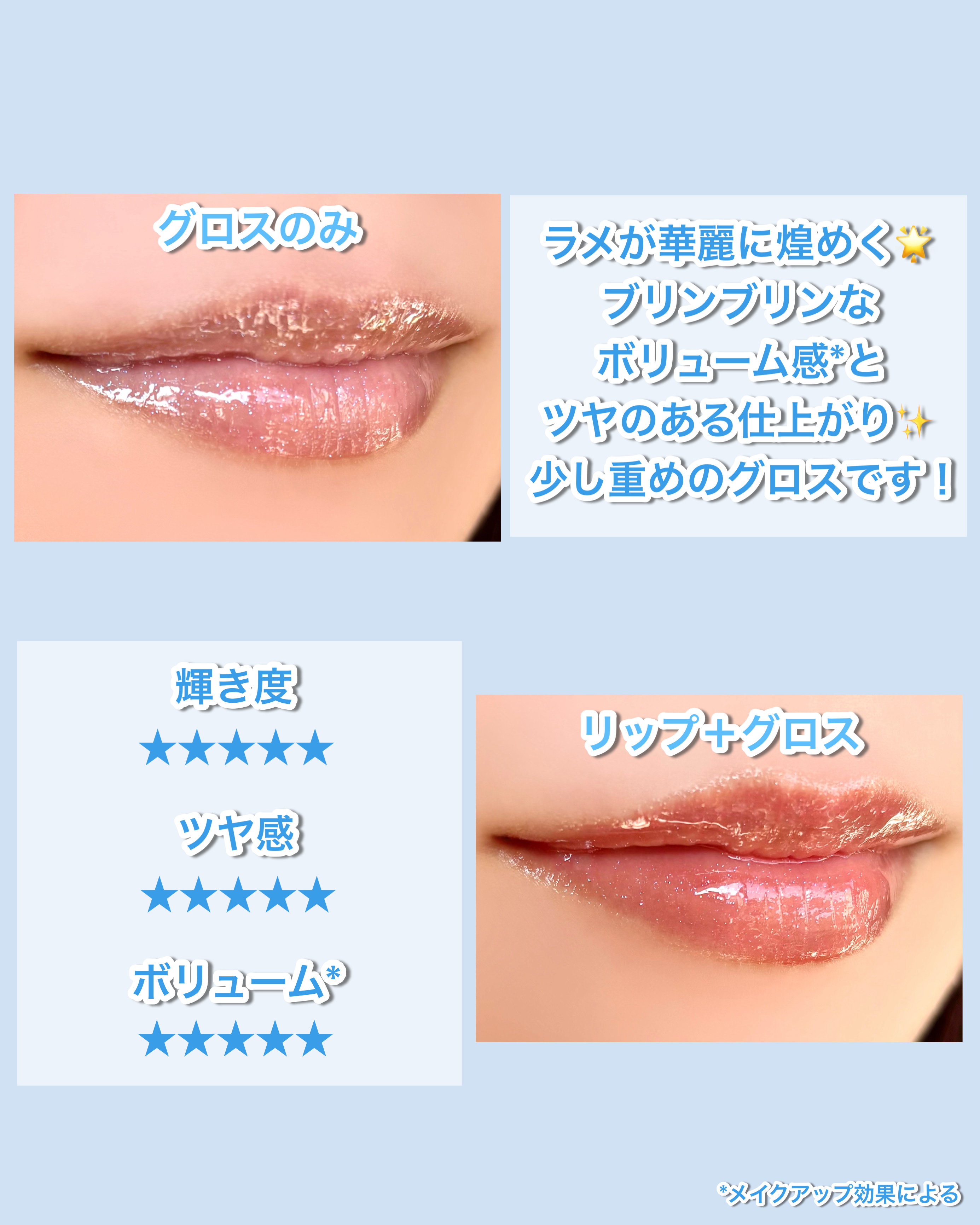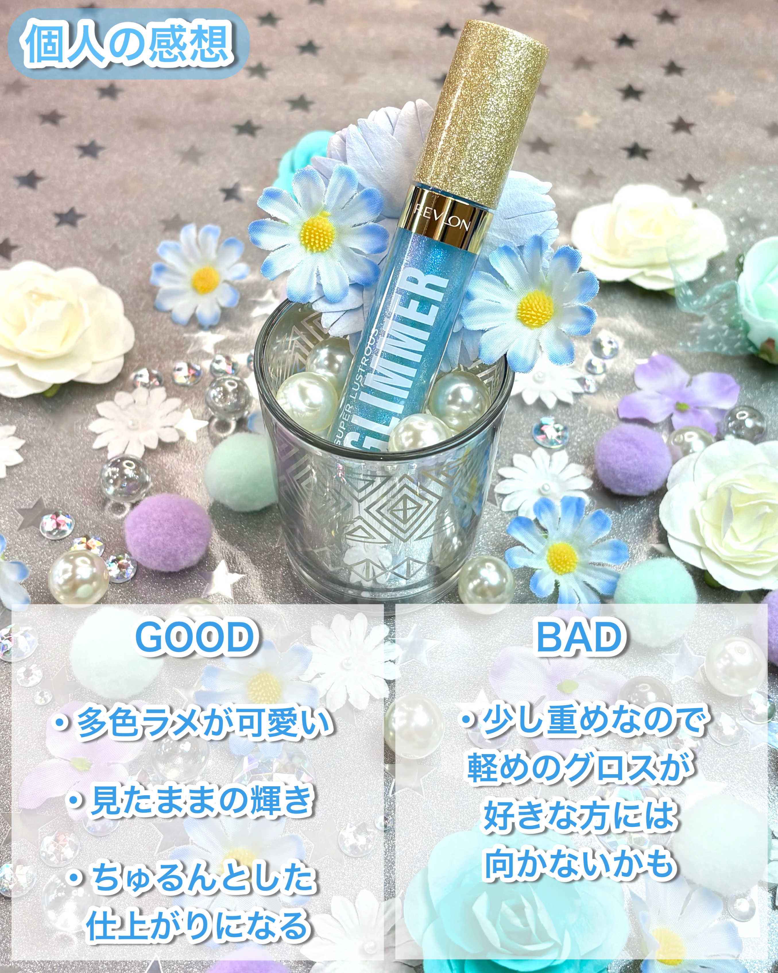【使った商品】●レブロンスーパーラストラスグリマーグロス010インディゴアイス¥1,430●口紅:ちふれ口紅(詰替用)549レッド系パール¥385いつもは色つきリップで済ませていますが、たまに口紅を塗ると乾燥を感じる時があるのでグロスを探していたところ、偶然見かけて「ブルー!きれい✨️」となって購入しました!【色味】ブルベカラーの口紅しか持っていませんが、グロスを塗ると更に青みがかった色合いに!目に見えて青色!と言う感じではなく、馴染みやすい透明色に近いクリアなブルーです。すぐに落ち着いてきます。色は高発色ではないので使いやすいと思います!反射する光が青みがかっています。ブルー〜紫ピンクのラメがキラキラしています。眺めてるだけで可愛い✨️メイクが楽しくなるアイテムです。【質感】ラメは繊細で小粒でざらつきなどは気になりません。敏感肌ですが、痒みや痛みも感じることはありませんでした。【保湿】乾燥を感じる口紅にONするとしっとりと潤います。唇がぷるっとふっくらする感じもあります💡【青みが欲しい!って時に】口紅のカラーが少しイメージと違ったり、もう少し青みが欲しいって時に活躍しています。#リップグロス#リップ#口紅