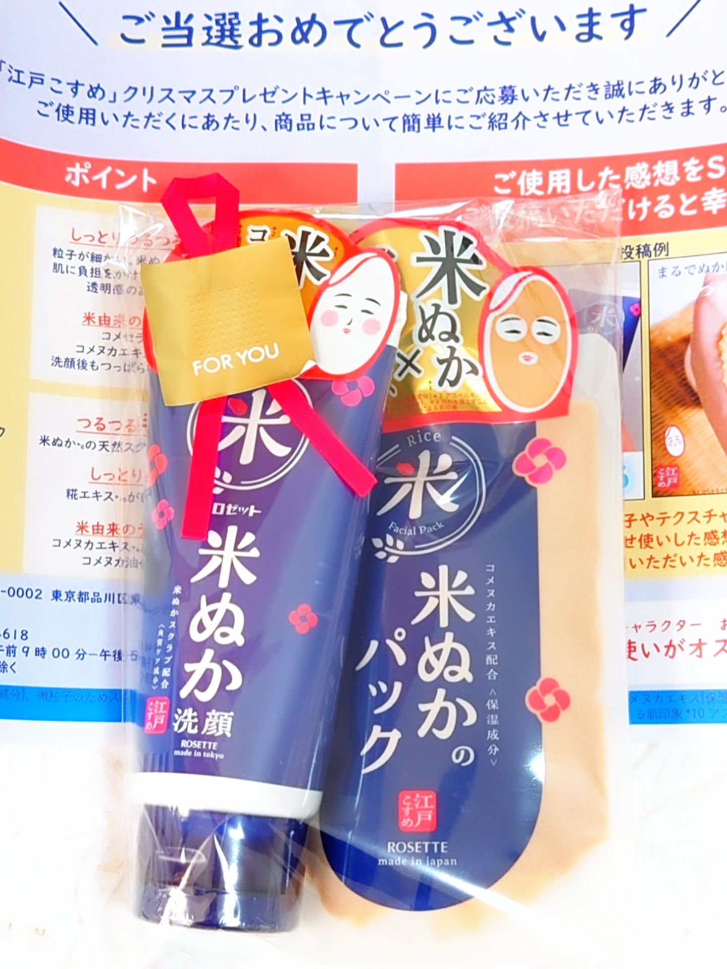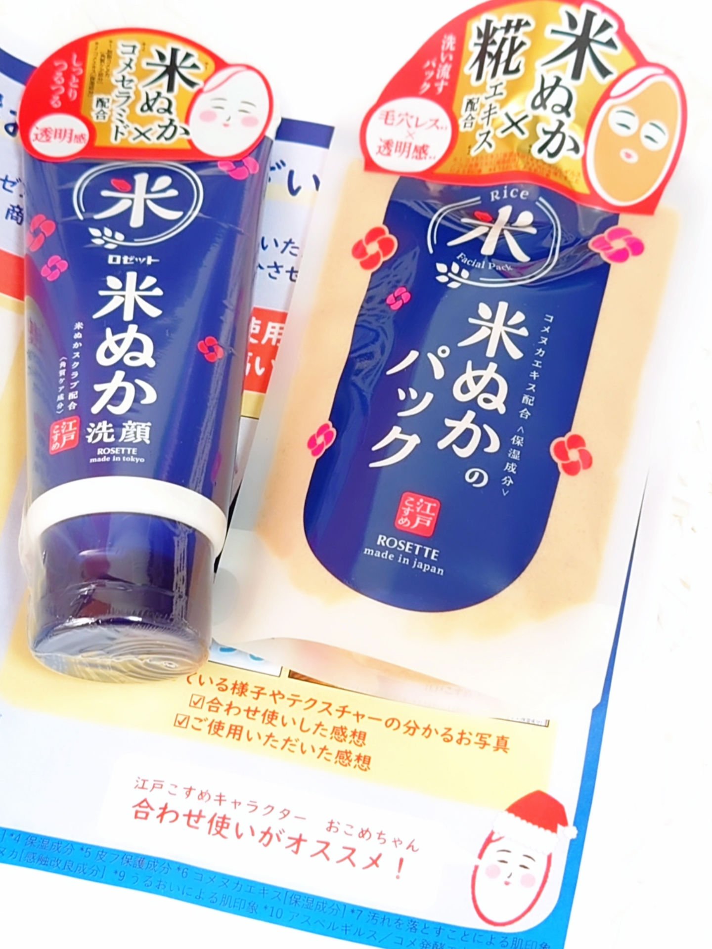 Xを通してロゼット様のCPに当選し、保湿成分配合の江戸こすめの米ぬか洗顔&パックを頂きました🫧江戸時代から伝わる肌に優しい米ぬか美容☺️洗顔は泡立ちがよく肌つっぱらない✨️パックはぬかの感触が心地よい❣️どちらもしっとりして保湿の高さを実感しました🥰この度はありがとうございました🍀