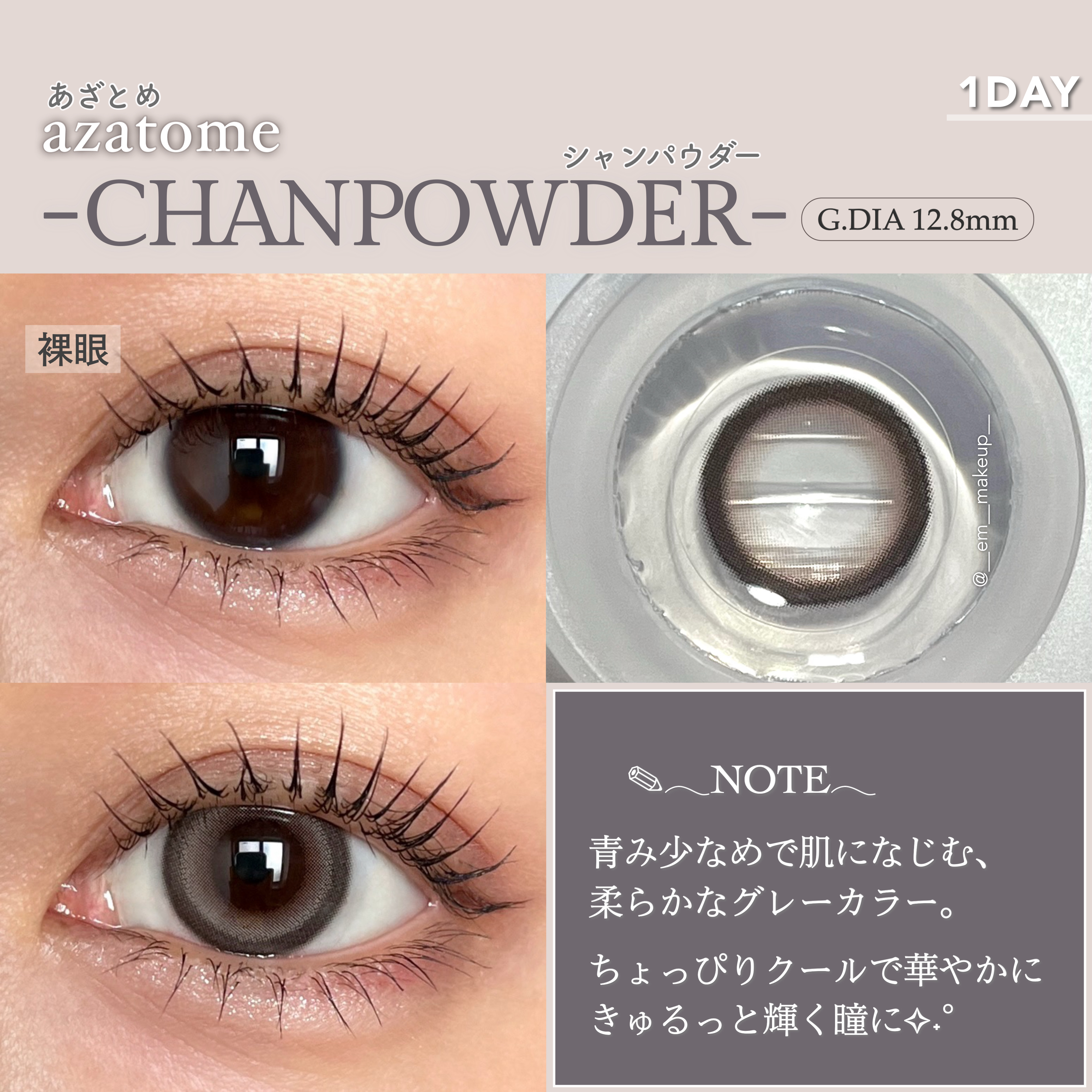 🖤azatomeCHANPOWDER(シャンパウダー)¥1,760前に紹介したazatomeの新色が登場🥹✨️白み強めのグレーカラコンできゅるんとした瞳になれちゃいます👏✅DIA:14.0mm✅G.DIA:12.8mm✅BC:8.7mmG.DIA(着色直径)が12.8mmだからナチュラルに盛れて使いやすい❣️ただ、ハイライト入ってないし太フチだからカラコン着けてるのはバレるとは思う校則や会社が厳しくてカラコンつけてるのバレたら困る〜💦って人には向かないかも友達と遊びに行く時とかデートには使いやすいサイズと色味💖前も書いたけど、私は裸眼が10mmくらいしかないので…12.8mmはフチはみ出ないしめっちゃ使いやすい🫶高発色なのも大事‼️azatomeは着け心地もいいしサイズも丁度いいから本当に重宝してます🥰他の新色も買ったからまたレポするねー!きゅるんとしたあざとい瞳になれるグレーカラコンをお探しの方はぜひ試してみてね💕︎※azatome(BLACQUEEN)レポはこちら→https://lipscosme.com/posts/7873356?_t=zLqY&_r=PQr4x#カラコンレポ#グレーカラコン#新色#アイメイク#ブルベ夏いつもいいね🤍&保存🖇ありがとうございます!コメントもお気軽に💬この投稿がよかったら他の投稿もチェックしてみてね👀【前回の投稿】インテグレートフラットスキンメーカーhttps://lipscosme.com/posts/7906969?_t=zLqY&_r=PQr4x