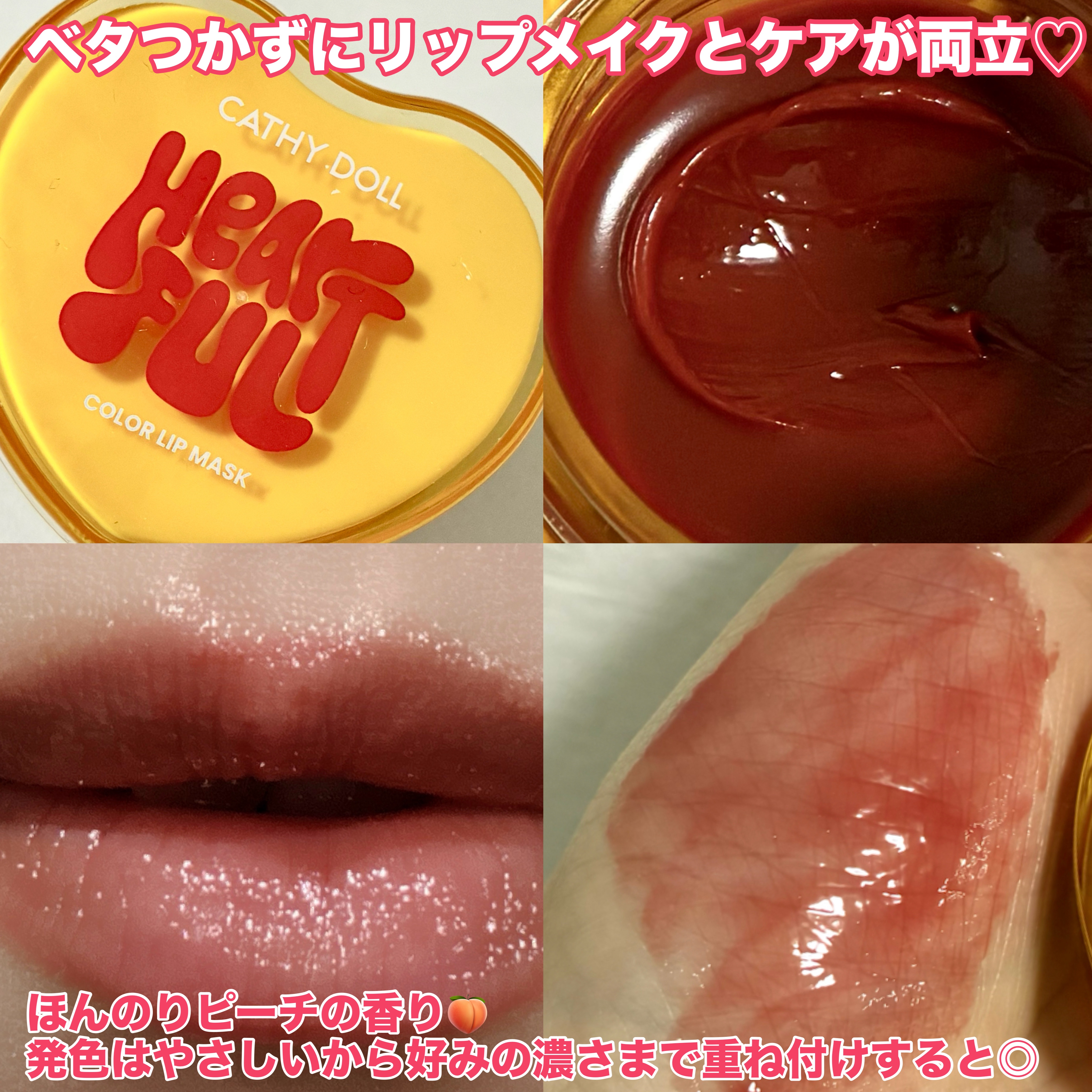 ぷるっととろける透け感×血色🩷うるツヤ叶えるリップマスク💄🫧🩷CathyDollハートフルカラーリップマスク08DriedStrawberry7g¥1,430(税込)全国のドン・キホーテで2025/9月より順次発売中♡日中のリップケアや夜のリ...