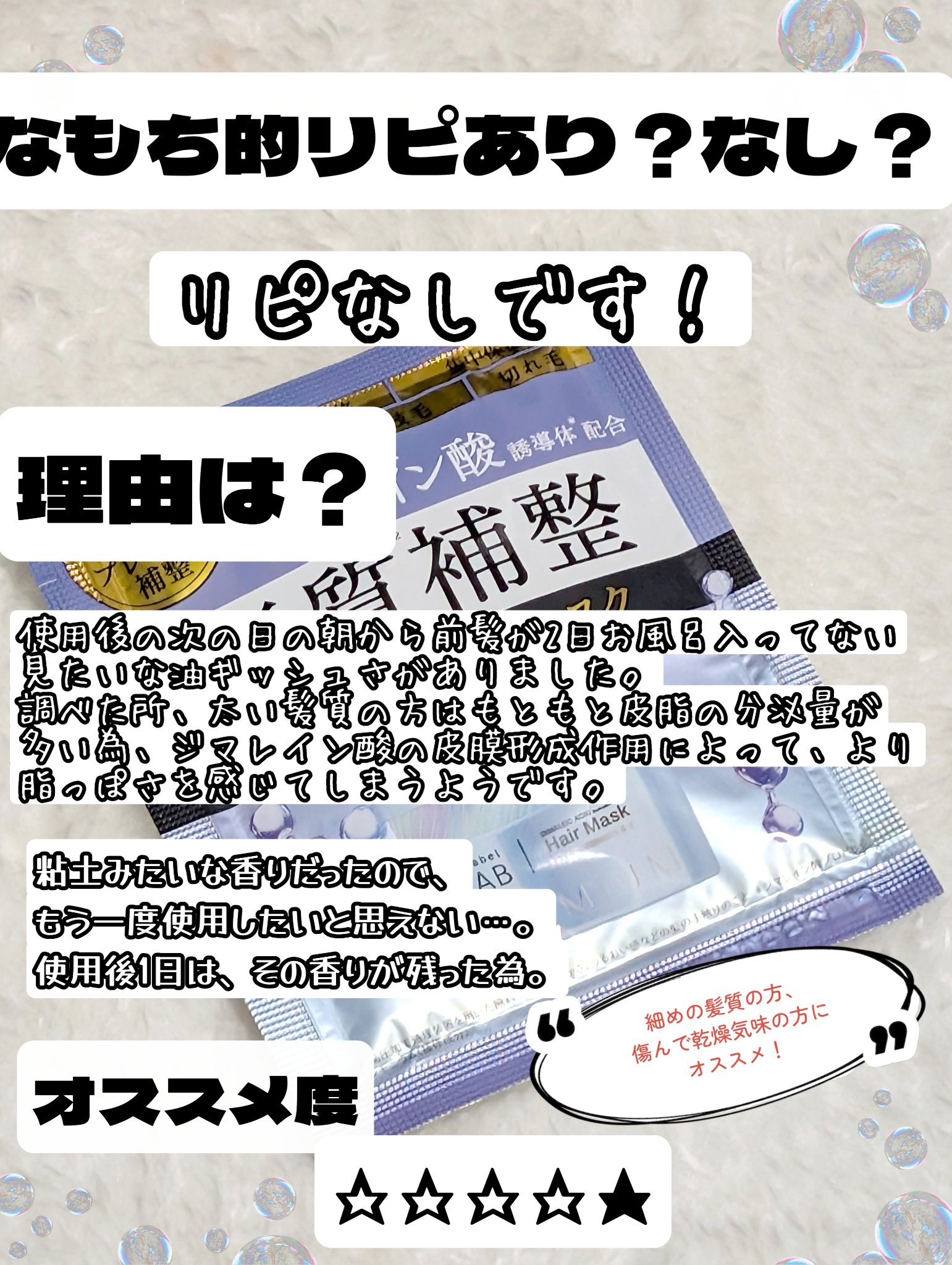 | ヘアケア・スタイリングランキング第52位 | めちゃくちゃかわいいヘアトリートメント!お風呂上がりはサラサラ感強めのしっとり♡ | 詳細を見る | |