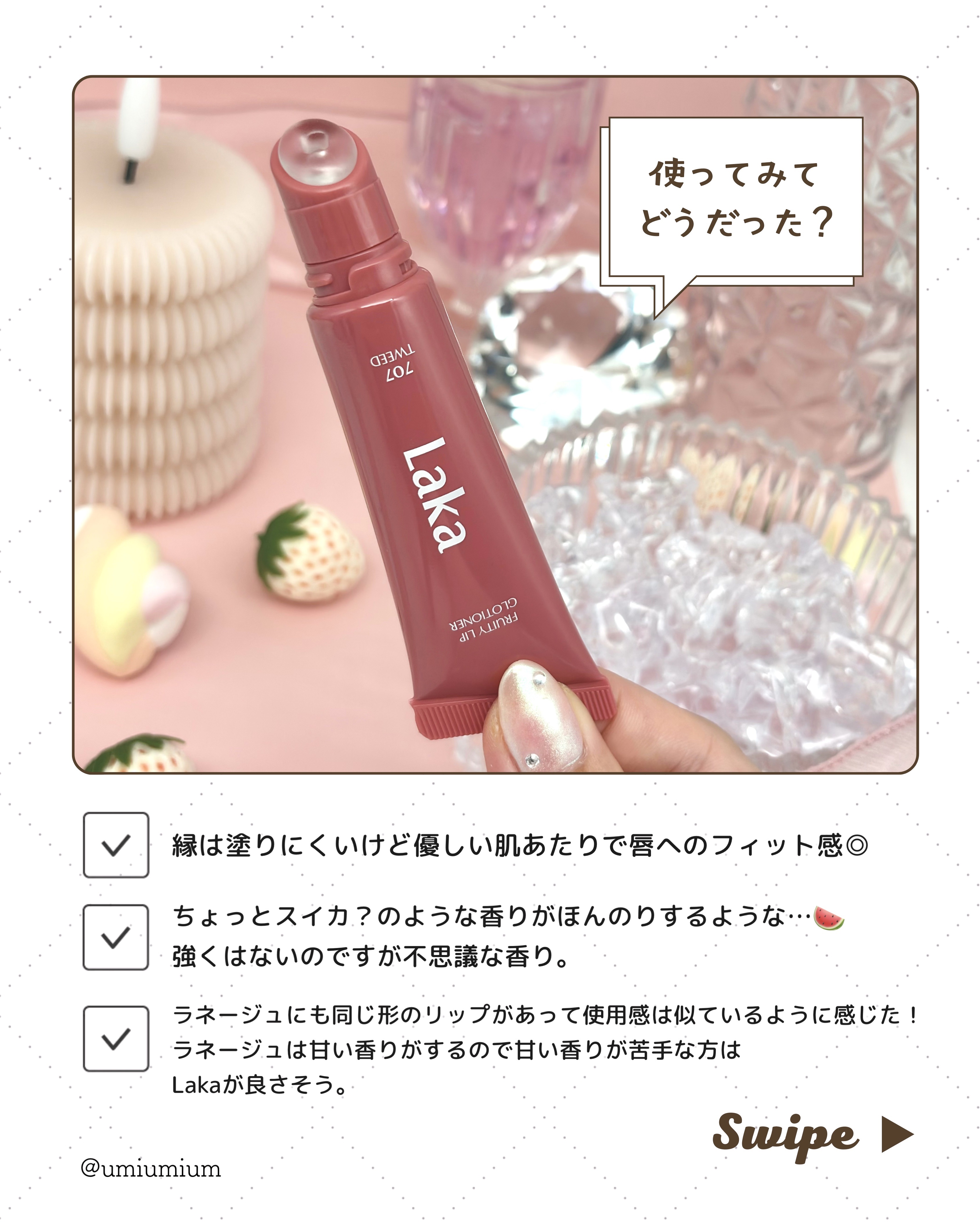 Lakaフルーティーリップグローショナー#707ツイードやたらSNSで見かけるLakaのチューブタイプのリップ実際どうなんだろう?って思ってゲットしました!1本で発色はするけど色持ちは全然しない感じだから塗り直しができない日は下にティントを仕...