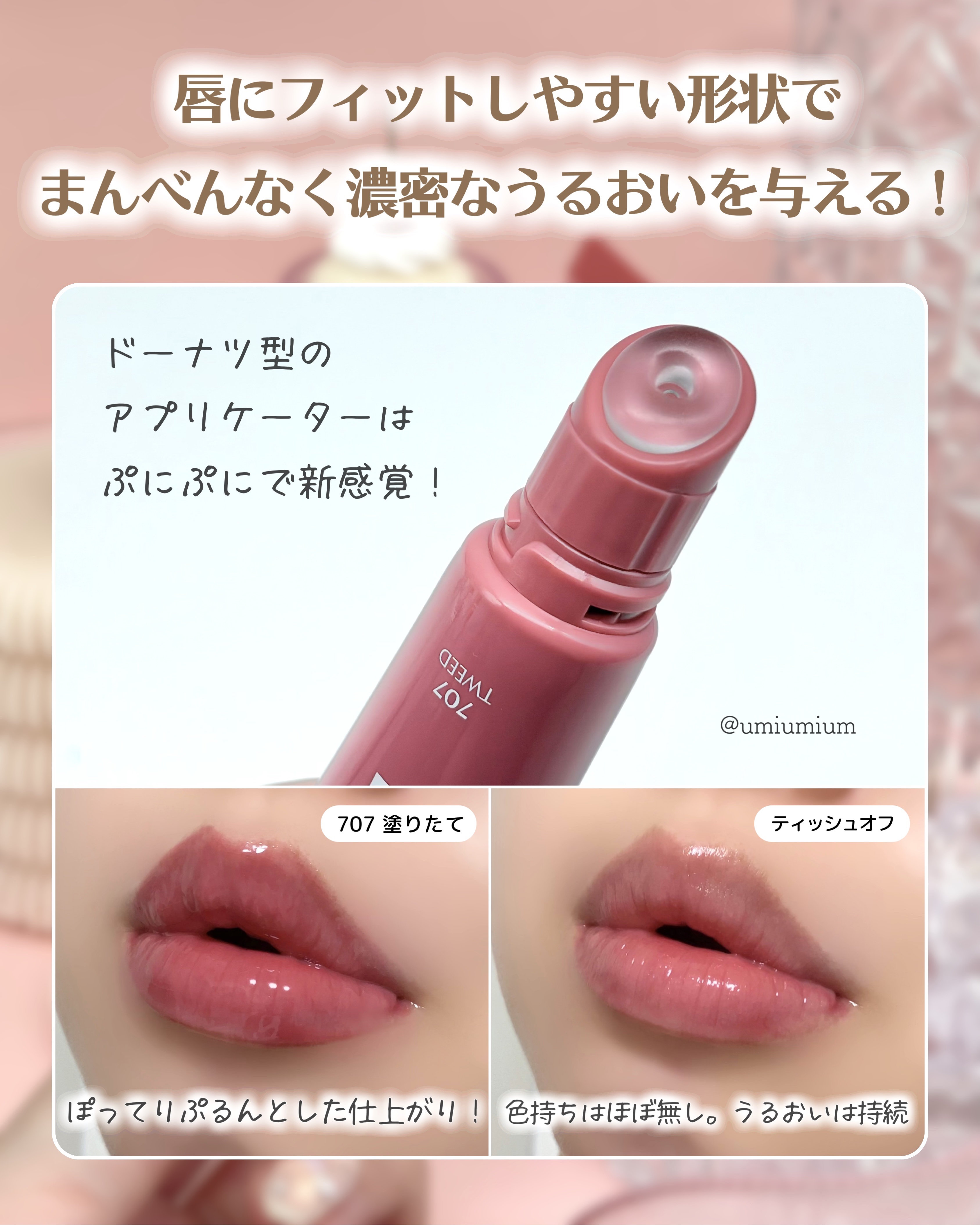 突如現れたLaka新作はドーナツリップ🍩✨┈┈┈┈┈┈┈┈┈┈┈┈┈┈┈┈Lakaフルーティーリップグローショナー全10色各¥1,980(税込)┈┈┈┈┈┈┈┈┈┈┈┈┈┈┈┈こんにちは!うみかです!いつも♡📎フォローありがとうございます🫶🏻本日はLakaから突如現れた新作リップグロスをご紹介。リップグロスとリップコンディショナーのハイブリッドでぷるんと光沢感のあるツヤ仕上がりのリップです。私はPLAZAでゲットしました🛒✍🏻ポイントはこちら┈┈┈┈┈┈①唇にフィットしやすい形状で、まんべんなく濃密なうるおいを!②うるおいたっぷりの濃密なテクスチャーで保湿力◎③ナチュラルな全10色のカラー展開。カラーを楽しみながらケアもできる!私が購入した707ツイードはまろやかな青みのぶどうみたいなカラー🍇🗒️使ってみた感想┈┈┈┈┈┈┈ぷるっぷるになるので持ち歩いて唇の日中の保湿ケアに◎なんかちょっとスイカ?のような香りがほんのりするような…🍉強くはないのですが不思議な香りでちょっと気になりました🤔ドーナツ型のアプリケーターはぷにぷにで新感覚!縁は塗りにくいけど優しい肌あたりで唇へのフィット感が◎ラネージュにも同じ形のリップが既にあって使用感はかなり似ているように感じました。ラネージュは甘い香りがするので甘い香りが苦手な方はLakaが良いのかなと思います🙆🏼♀️✨投稿時点だと店頭のみの取り扱い。今後Qoo10にも来て欲しいな〜!┈┈┈┈┈┈┈┈┈┈┈┈┈┈┈┈🛒販売情報LOFT、PLAZA、アットコスメの店舗にて2025年8月29日(金)より先行販売┈┈┈┈┈┈┈┈┈┈┈┈┈┈┈┈気になっている方のご参考に少しでもなりますと幸いです!その他Instagram投稿はこちらから!@umiumium7777ここまでお読みいただきありがとうございました☺️#Laka#Laka新作#フルーティーリップグローショナー#新作コスメ#新作リップ#新作#バズコスメ#バズりコスメ#ドーナツリップ#リップグロス#リップ#ツヤリップ#韓国コスメ#韓国リップ#リップメイク#保湿リップ#夏の保湿ルーティン