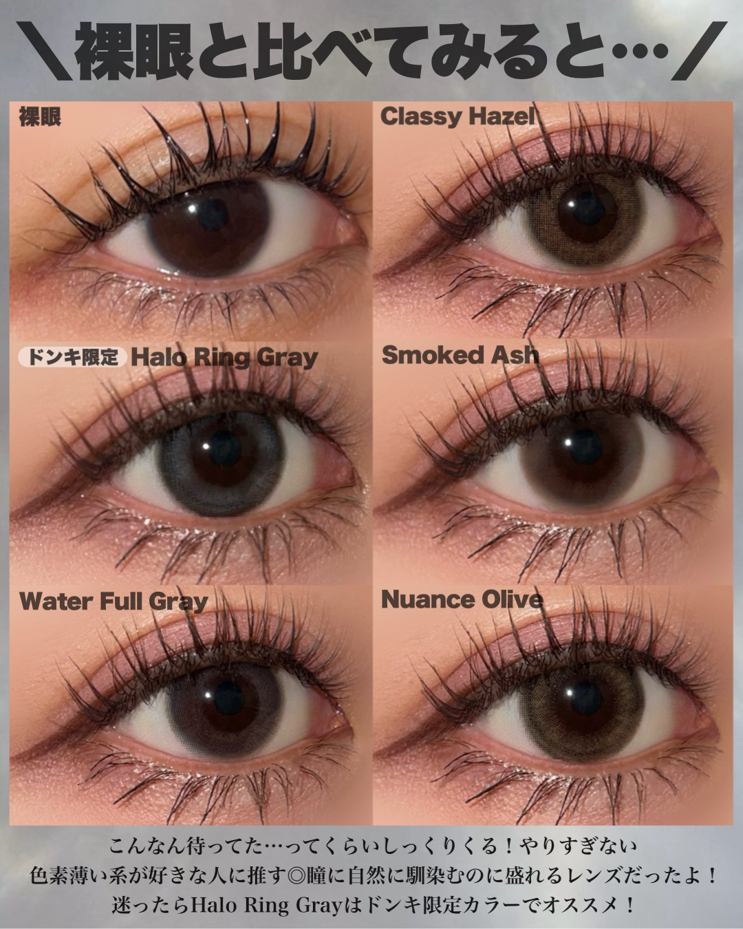 \みちょぱプロデュースの新カラコンブランド登場🌺🌴/GROVI全色紹介💛🩶GROVI#PR@grovi.official1DayDIA14.2mm着色直径13.5mm13.0mm13.2mmBC8.6mm┈┈┈┈┈┈┈┈┈┈┈┈【ドンキ限定カラー】#ヘイローリンググレー立体感と透明感を演出するなめらかグラデのリングデザイン💙白っぽグレーでしっかり盛れるのに派手すぎず普段使いにピッタリ💡💕#ウォーターフルグレー透き通るような水っぽグレー💧🩶着色がとことん薄く膜が張ってるような感覚で楽しめる!盛るというより雰囲気を変えるのにピッタリ!#クラッシーヘーゼルなんとなくこれが一番みちょぱっぽい💛繊細なブラウンでやりすぎないハーフ感!スモーキーなメイクにとっても合いそうだし強めのメイクをしても怖い目にならないと思われる😌✨#スモークドアッシュスモーキーなアッシュグレーでぼやぼやとしたデザインが特徴!!目を強調してくれるわけではないものの静かなクールさを演出してくれる🖤カラコン感を抑えたい人にもいいと思う😘#ニュアンスオリーブこれが一番可愛らしい🍎キラッと光が入る絶妙オリーブ!個人的にはオリーブというよりベージュをとても感じたけど瞳をきゅるっと強調してくれてカラコン感もあってすき!!Theナチュ盛れ🥹✨全体的にみちょぱっぽさがあってスモーキーな感じが派手すぎず強すぎず程よく盛れる🍒ヘイローリンググレーがドンキ限定カラーなのでぜひ店頭で見てみてね🩶#GROVI#グロヴィー#新色#ハーフカラコン#ナチュラルハーフカラコン#細フチカラコン#ナチュラルカラコン#ニュアンスカラコン#新作カラコン#みちょぱ#みちょぱカラコン#みちょぱプロデュースカラコン#カラコン着画公式画像については許可を得て使用させていただきます。