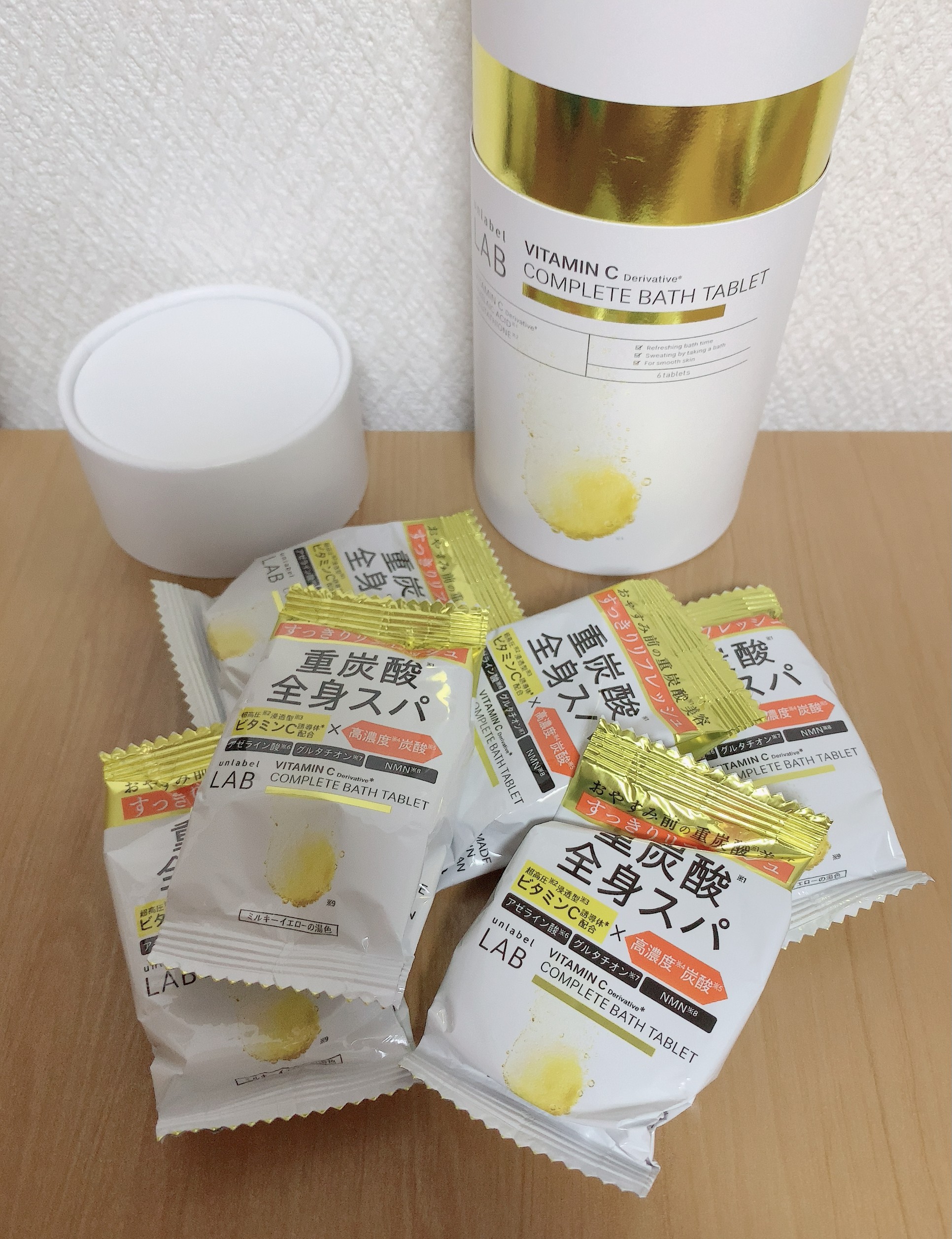 .アンレーベルラボVコンプリートバスタブレットおやすみ前の重炭酸*1美容🌙✨超高圧*2浸透型*3ビタミンC誘導体*4配合、高濃度*5炭酸*6が特徴のバスタブレットですさらにアゼライン酸*7、グルタチオン*8、NMN*9も配合されていますまるで美容液ですね♪筒状のパッケージはアンレーベルっぽさのあるデザインで店頭ですぐ見つけられましたこの容器は子供達に大人気ですぐ持っていかれそうになります😅中には6錠入っていますタブレットは黄色くて厚みがありますお湯に入れるとぶくぶくと溶けていき、レモンのような柑橘系の香りが広がりましたメディテーションハーブの香りだそうで結構爽やかな良い香りでした湯色はミルキーイエロー💛しっかり黄色なのににごり湯なのが新しいです!ピリピリ感のないまろやかでしっとりなお湯になり、私の乾燥しやすい肌にも合っていました◎からだがじんわりと温かくなって疲れた日の夜にぴったりです*1炭酸水素ナトリウム(基剤)*2超高圧加工処理装置を用いた原料*3角質層まで*4テトラヘキシルデカン酸アスコルビル(保湿成分)*5アンレーベル CO バスタブレットと比較して*6炭酸ナトリウム(基剤)*7整肌成分*8保湿成分*9ニコチンアミドモノヌクレオチド(保湿成分)#アンレーベル#重炭酸#バスタブレット#入浴剤#バスタイム#ご褒美ボディケアタイム