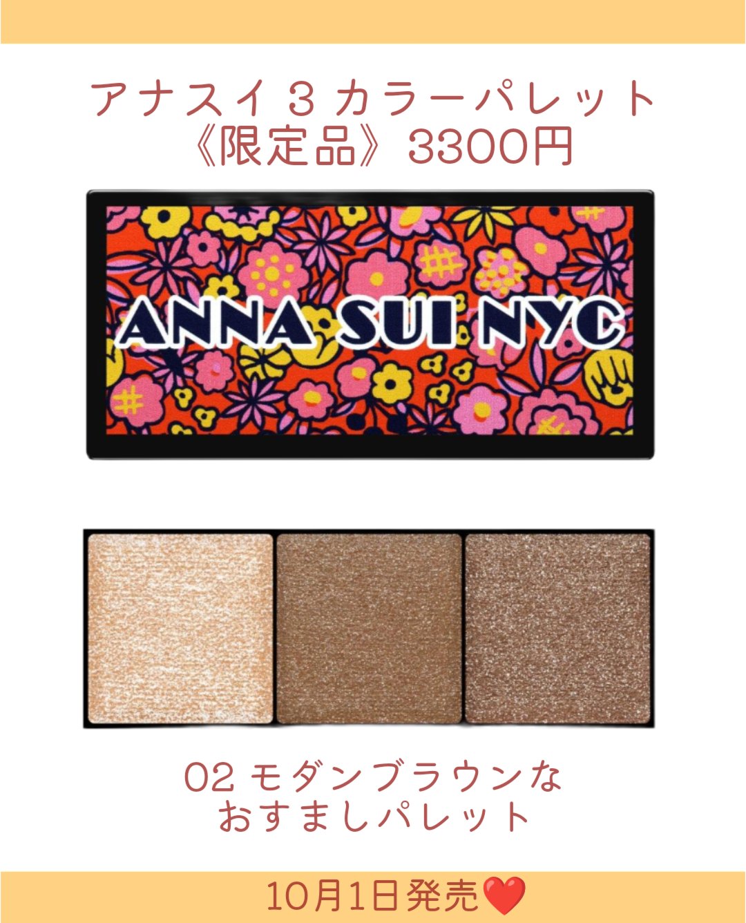 10月1日(水)から限定発売🎉ANNASUINYCの新作「3カラーパレット」がついに登場!!先日ANNASUIの新商品発表会にご招待いただきました💐4パターンのデザインはどれもかわいすぎて迷っちゃう…!毎朝のメイク時間がもっと楽しくなる꒷꒦...