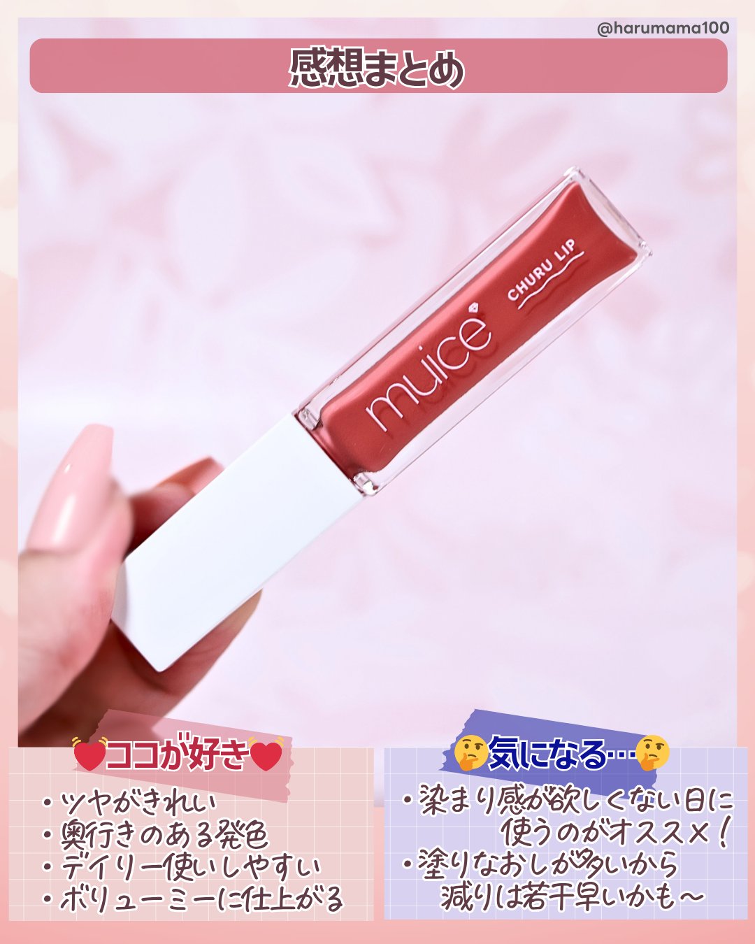 潤い◯のリッププランパー。一本でも重ね塗りでも!muiceちゅるリップランパー07ヌーディーローズほんの少しくすみを感じるニュートラルなローズピンク。これ一本でも割と発色します。私は地の唇の色が血色良くなった感じになりました。ご飯食べた後帰るだけならこれ一本で充分。色は時間経過で徐々に抜けてくる感じがするので、唇の色をキープしたい場合は他のリップとの重ね塗りをおすすめします。色持ちについてはティントじゃないから許容範囲内。プランプ効果は後から来ます。塗った後しばらくしてからジンジンじわじわとした感じがします。痛いと言うほどではありませんが、やっぱプランパーだなあと感じる程度。あからさまにぷっくりするというより、ツヤ効果もあり元々唇がふっくらした人のように見えます。とても良かったのは保湿力。これ一本で塗ってもしっかり保湿されて荒れない。リップクリーム要らず。ツヤの膜が強いのか、乾燥からも保護される感じがします。リップをティッシュで落とした後もしばらくしっとり感が続きます。唇よわよわ族には予想外に嬉しいこの効果。ただプチプラコスメではあるのですが、割合小容量なのと、色持ちが欲しい場合はこまめに塗り直す必要があるので減りはそこそこ早そうです。ぽってりしたツヤもあり、保湿力もあり、秋冬に向いたプランパーだと思います。#muice#ミュアイス#ちゅるリップランパー#ヌーディーローズ#リッププランパー#プランパー#プチプラコスメ#プチプラ#プチプラリップ#リップ#リップメイク#コスメ#レビュー#正直レビュー#マル秘爆盛れ自撮り術