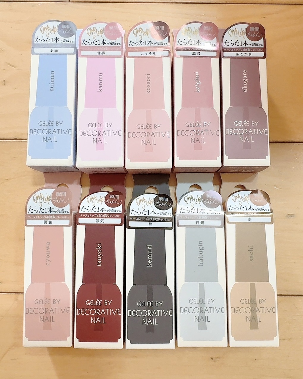 - One Step! 瞬間ちゅるん たった1本で完成する ベースもトップも拭き取りもいらない それぞれの物語を持ったこだわりのネイルカラー GELÉE BY DECORATIVE NAIL 全部思いのまま、偏愛※ちゅるんとジェル ※偏愛…特定の人、物、または活動に対して特別な愛着や好意を持つこと new! 4年ぶりに新シリーズを発表。合わせてパッケージ、ネイルカラーすべてを刷新 新たな時代にふさわしい、トレンド感を取り入れた心躍るネイルを自信をもってお届けします すべてHEMAフリー アクリル酸成分(HEMA)不使用 △マニキュアではありません。UV・LEDライトが必要です。