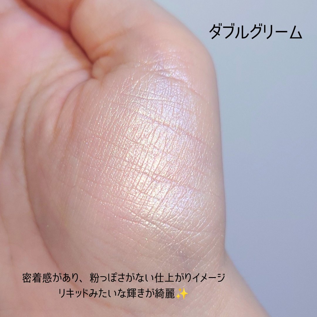このエクストラディメンションスキンフィニッシュのシリーズは比較的粉質はしっとりめでしっかり発色してくれて しっかり艶を与えてくれるタイプだと思います。 今回レビューしているダブルグリームは白っぽいシャンパンベージュカラー。 頬の高いところに乗せれば つやんつやんなお肌を演出してくれます!