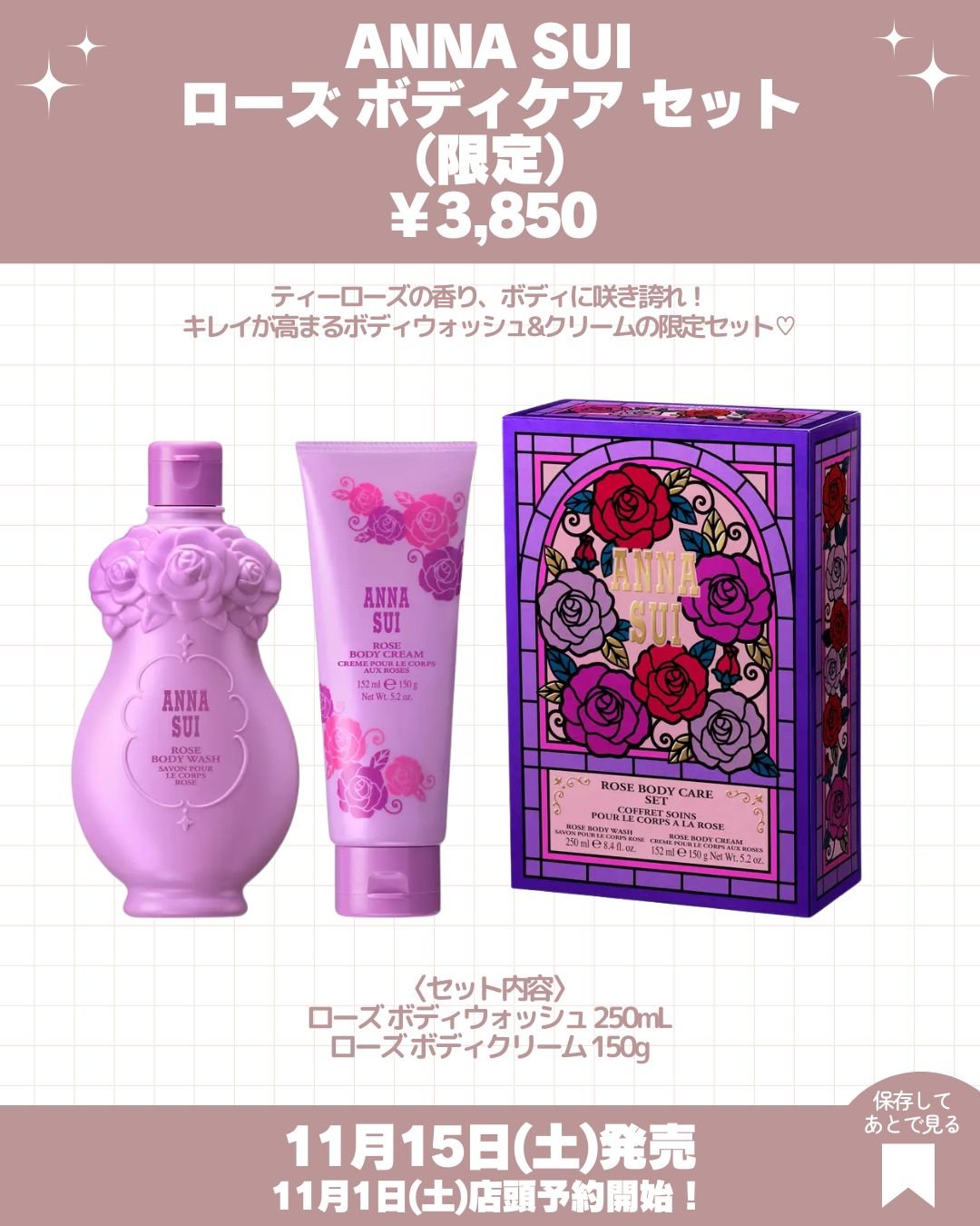 【速報】アナスイ2025年クリスマスコフレ情報~!こんにちは!kumasakuです🐻@ckumacom▲過去の投稿はここからチェック!アナスイの2025年クリスマスコフレ【第1弾&第2弾】をまとめてご紹介します♡保存して欲しいクリスマスコフレを見逃さないように🐻【ご紹介アイテム】ANNASUI(アナスイ)2025年クリスマスコフレ【第1弾】全国発売日:11月1日(土)予約開始日:10月18日(土)店頭予約開始→メイクアップコレクション01(限定)¥7,15001アイシーでロマンティックなコフレ(限定)〈セット内容〉・アイ&フェイスカラー01 ・リップスティックリミテッド400・ポーチ→メイクアップコレクション02(限定)¥7,15002あたたかみのある大人レディなコフレ(限定)〈セット内容〉・アイ&フェイスカラー02 ・リップスティックリミテッド300 ・ポーチANNASUI(アナスイ)2025年クリスマスコフレ【第2弾】全国発売日:11月15日(土)予約開始日:11月1日(土)店頭予約開始→ローズボディケアセット(限定)¥3,850〈セット内容〉・ローズボディウォッシュ250mL・ローズボディクリーム150g→ローズボディオイル(限定)¥4,180→ローズボディパウダー(限定)¥7,700〈セット内容〉・ローズボディパウダー40g・ビッグパフ→ハンドクリーム40g¥2,200→リップトリートメントバーム20g¥2,200次回も話題の新作コスメの最新情報などご紹介しますのでお楽しみに!------------------------------------※画像はLIPS様よりお借りしました。#アナスイ#ANNASUI#コフレ#クリスマスコフレ#ホリデー#ホリデーコレクション#デパコス#パケ買い#パケ買いコスメ#新作#限定コスメ#限定コフレ#ポーチ付きコフレ#デパコスコフレ#アイシャドウ#アイカラー#リップ#リップスティック#ボディケア#ボディクリーム#ボディオイル#ボディパウダー#ハンドケア#ハンドクリーム#リップケア#リップバーム#アナスイクリスマスコフレ