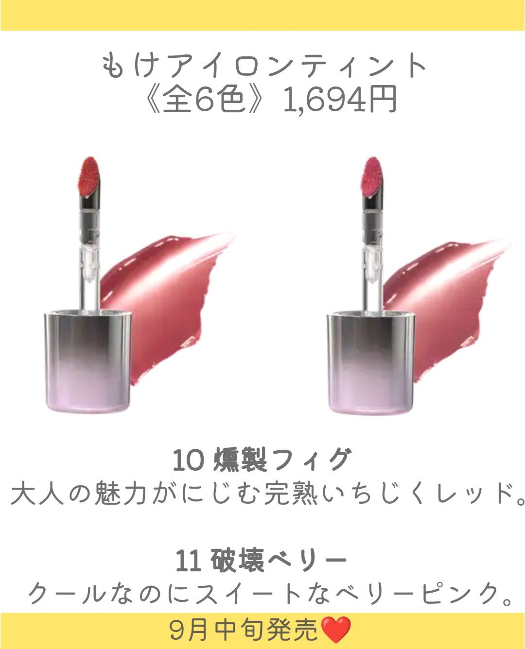 - 【POINT 1】もけもけブラシ×アイロンチップ 柔らかく弾力あるブラシが唇のカーブにフィットし、ムラなく塗りやすさUP! ひんやり感触が気持ちいいアイロンチップでなじませてブラシ跡も残さない。 【POINT 2】存在感のあるカラー 新ブラシが液をたっぷり含み、一塗りで発色! まるで鏡のような輝きとみずみずしさ。 【POINT 3】潤いと色持ちを同時に叶える リップケア成分配合※で唇にうるおいもプラス。 カップに色移りもしにくい。 ※水溶性コラーゲン(保湿成分) <9月中旬>店頭発売 ロフト※およびロフトネットストア、PLAZA、ドン・キホーテ <9月12日(金)> オンライン発売 ・Qoo10 :JUDYDOLL / JOOCYEE 日本公式ショップ ・Amazon:秘密《mìmì》公式オンラインショップ ・秘密《mìmì》公式オンラインショップ ※ 一部店舗のぞく ※店舗によりお取り扱いが異なります。 ※予告なくお取り扱いを終了する場合がございます。