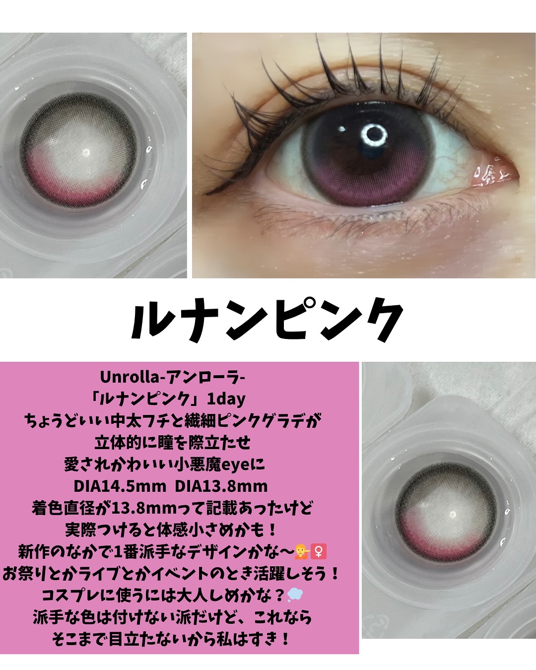 Unrollaルナンピンク高発色ピンクカラコン!軸固定だからピンクの可愛い部分をしっかり固定できます!!フチは若干太めですが着色直径はそこまで大きい感じはしませんでした!!シリコーン素材で目に優しくゴロゴロした感じもありませんでした!!とても...