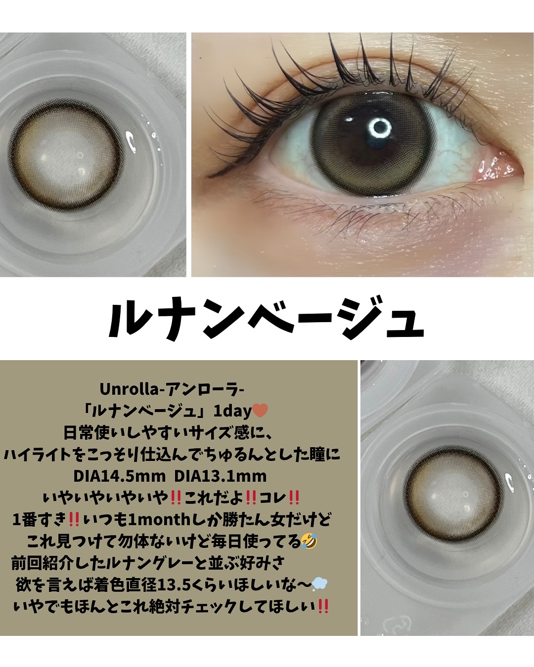 Unrolla水光レンズで回らないとなれば、買うしかないと思って全色購入👀色ごとに着色直径が違うのもポイント✨1番ナチュラルに見えるのはLunanBrown個人的に好きなのはLunanPinkどれも可愛いから、メイクに合わせて色味変えるのもい...