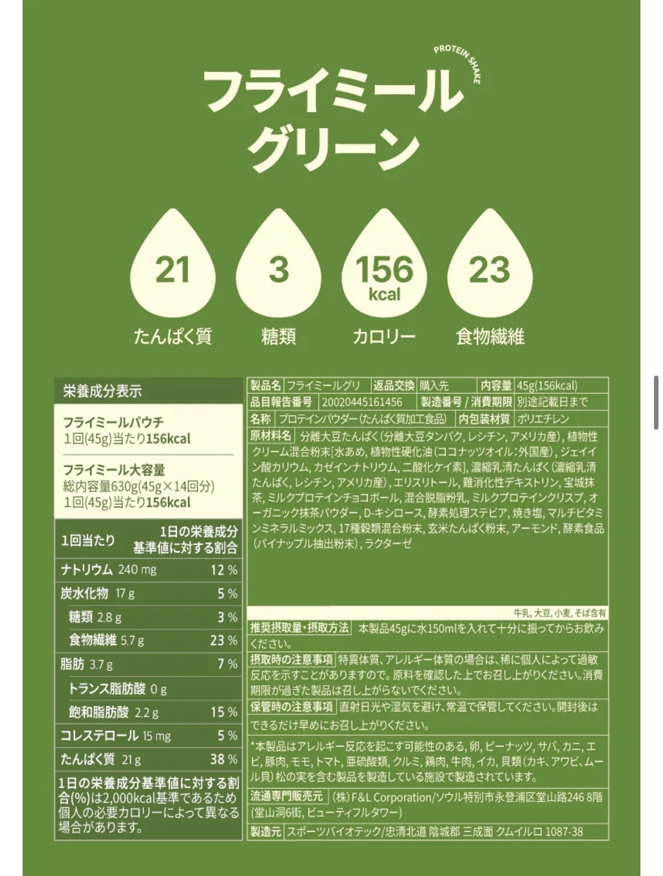購入品でした!飲み終わり‼️#FLIMEAL#フライミール#プロテインシェイク#グリーン #ほろ苦さと甘さの絶妙バランス抹茶オレ味Qoo10で購入してます。抹茶のような味、と書いてありましたので前回のメガ割?メガポだったかな?で購入しました。🤔残念ながら、抹茶には全然近くなくて本当に#グリーンティーの味で#緑茶ですね。色々と#プロテインボールが入っているという#韓国のプロテインを#ダイエット目的で購入してますが……こちらの#プロテインシェイクは、全体的にパフは少なめ。グリーンは本当に緑茶の味なので、#抹茶を期待して買うと後悔する‼️🍵緑茶も好きだけど、抹茶に近い味なんだろうと思って買ったから後悔した😢😑💔パフは小さくて少なめ。ホワイトチョコのようなチョコボールが少し入ってたぐらいかな。あと計量スプーンはボトルの中に入ってたので取り出すのが大変でした。シェイカーの口が小さめだと入れるのにも一苦労だった💦それから…最後の方。付属のスプーンでは救えず、ボトルを直接シェイカーに傾けてから入れようとしたらプロテインが入ったボトルの口はすごく大きいので、入れられず、沢山零してしまった😢とりあえずは、そんなこんなで。フライミールはクチコミレビューがかなり良かったので、期待して、まだまだ他の味も買ってるんですけど‼️今の感想としては、グリーンはリピートしません。他の味はどうなんだろうな?🤔🤔🤔#ドルチェラテと#イチゴがすごい人気っぽいけど今手元にあるのはレビューを参考に買ったのと、お茶好きだからかったドルチェラテイチゴ#ミルクティーだった気がするꉂ(ˊᗜˋ*)こちらも開封して飲んだらレビューします!