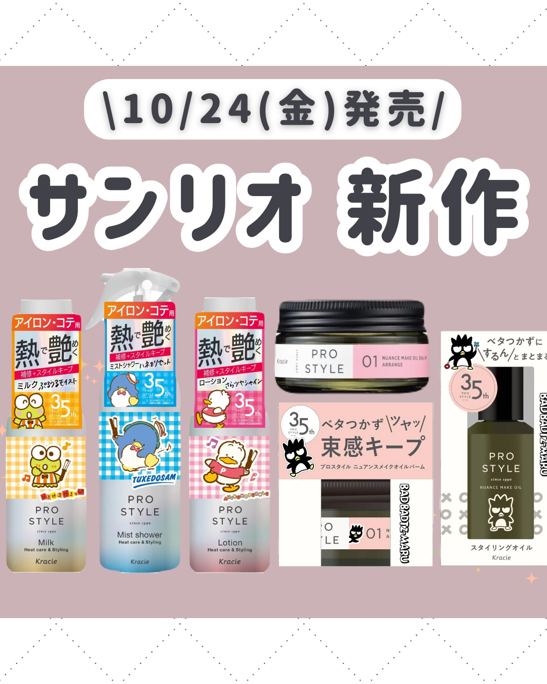 10/24(金)発売💚/プロスタイル"サンリオコラボ"新作アイテム●ヒートケア&スタイリングミルクけろけろけろっぴデザイン●ヒートケア&スタイリングミストシャワータキシードサムデザイン●ヒートケア&スタイリングローションあひるのペックルデザイン●ニュアンスメイクオイルバームアレンジバッドばつ丸デザイン●ニュアンスメイクオイルバッドばつ丸デザイン#スタイリング#スタイリング剤#ツヤ髪#美容#ヘアスタイリング#ダメージケア#コスメ#オイル#美髪#新作コスメ#新発売#ヘアスタイル#美容垢#寝癖直し#ヘアミルク#ヘアセット#ヘアミスト#サンリオコラボ#パケ買い#バーム#ツヤ感#ヘアワックス#ワックス#ダメージヘア#巻き髪#新商品#垢抜け