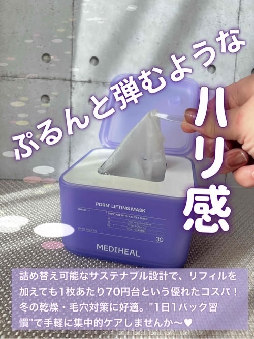 \パパっと手軽に1日1パック習慣/【PR】MEDIHEAL(@mediheal_jp)PDRNリフティングマスク[30枚マスク]乾燥が気になる冬も、話題の人気シートマスクで毛穴までスペシャルケア✨️純度99%のイギリス産植物性低分子ローズPDRNで、毛穴、ハリ不足、たるみのエイジングサインにアプローチ️📝リフィル対応だからコスパが良くてありがたい…!!#メディヒール