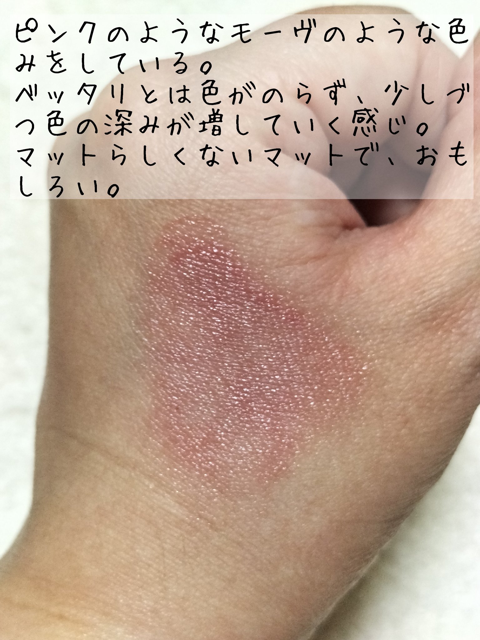 「メンソレータムフラッシュティントリップスモーキーピンク」を購入。 スルスルと塗れて、意外と唇が潤う。 マットらしくないマット(笑)。 「スモーキーピンク」なので、唇に落ち着いた印象を与える。ピンクのようなモーヴのような色みをしている。濃いめの色ではないので、普段使いしやすい。 唇の水分が吸われていくような感じはないので、マットが苦手な人でも使いやすいのではないかと思う。