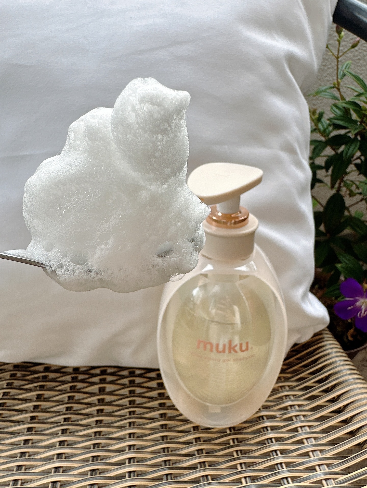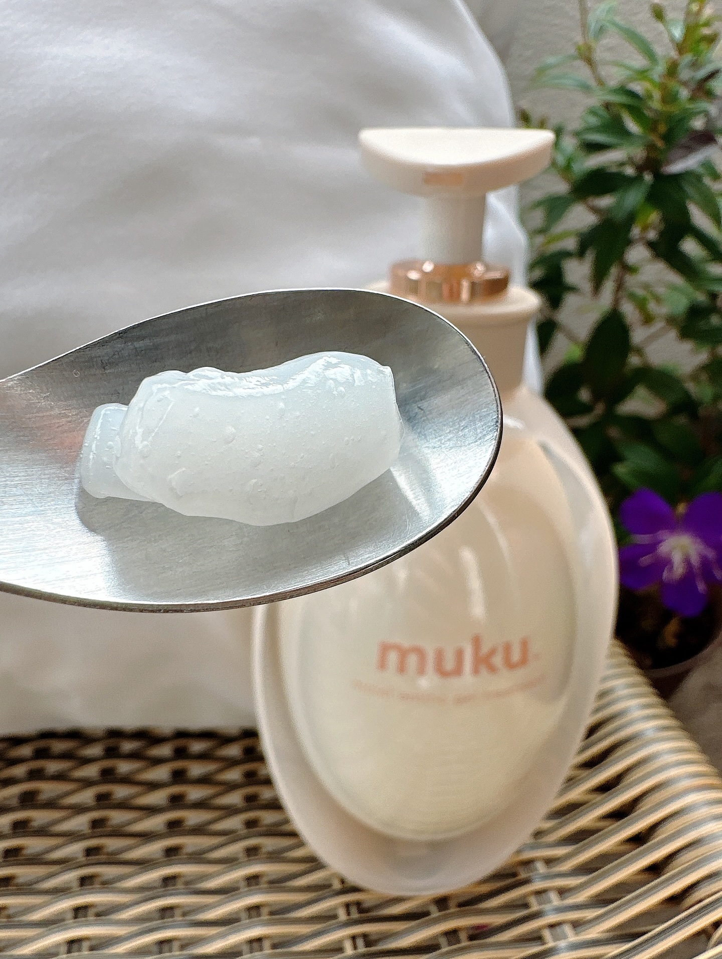 \とろけるような泡で洗う🫧/新感触のmuku+を使ってみました!ムク+ モイストアミノジェルシャンプームク+ モイストアミノジェルトリートメントシャンプーはとろっととろみあるジェル状テクスチャーで手のひらで5秒ほど白くなるまで揉み込んでから使...