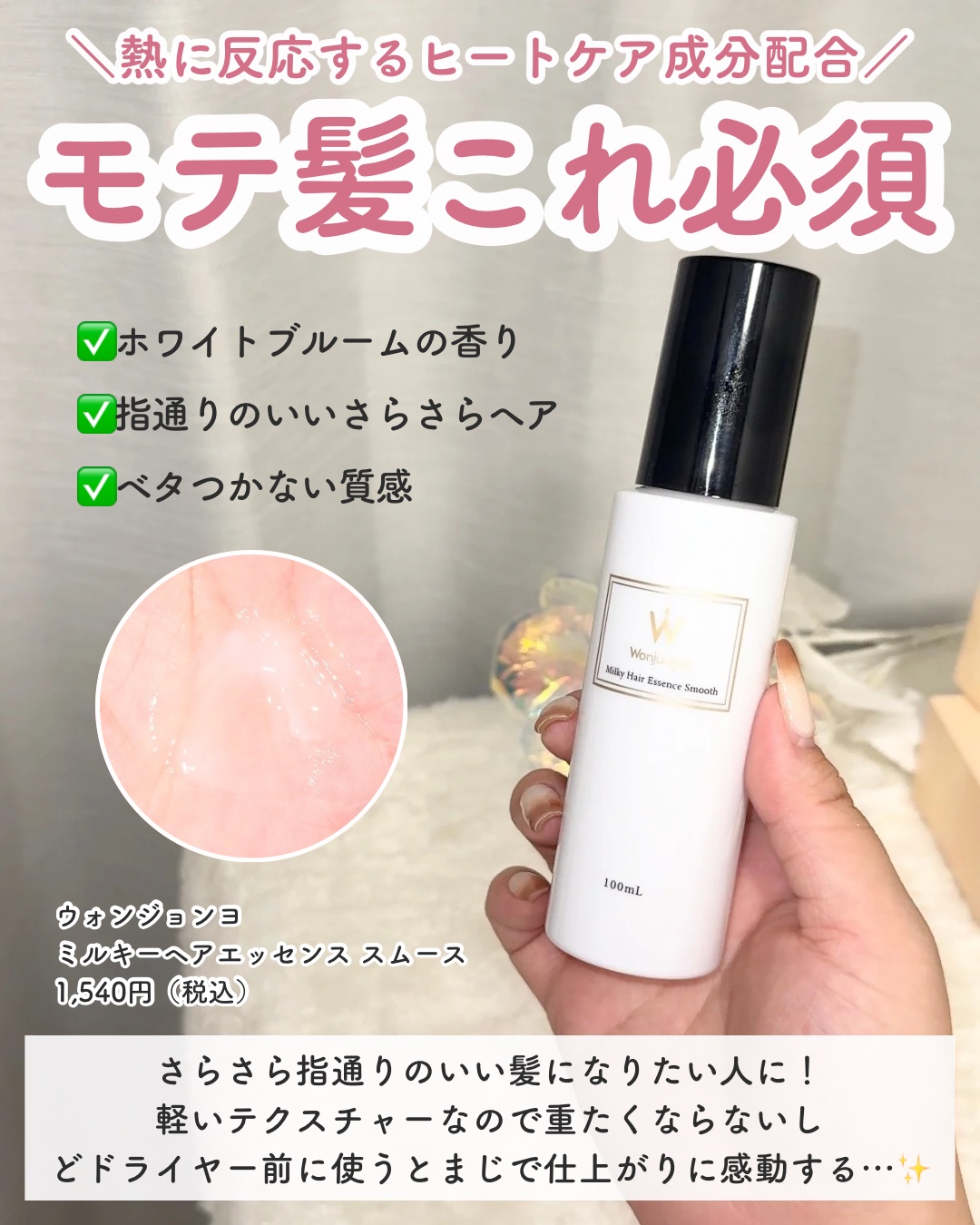 ウォンジョンヨミルキーヘアエッセンススムースを購入♡私はブリーチしてるためウォンジョンヨミルキーヘアエッセンススムースをしてからオイルを塗りますがWonjungyoの香りも落ち着いていてよかったです(*≧∀≦*)ブリーチしてる髪の毛ですがケアを頑張りたいくって購入しましたがよかったです😊お出かけ前にコテする前にも使っていて軽いつけ心地でよかったです🎀🤍