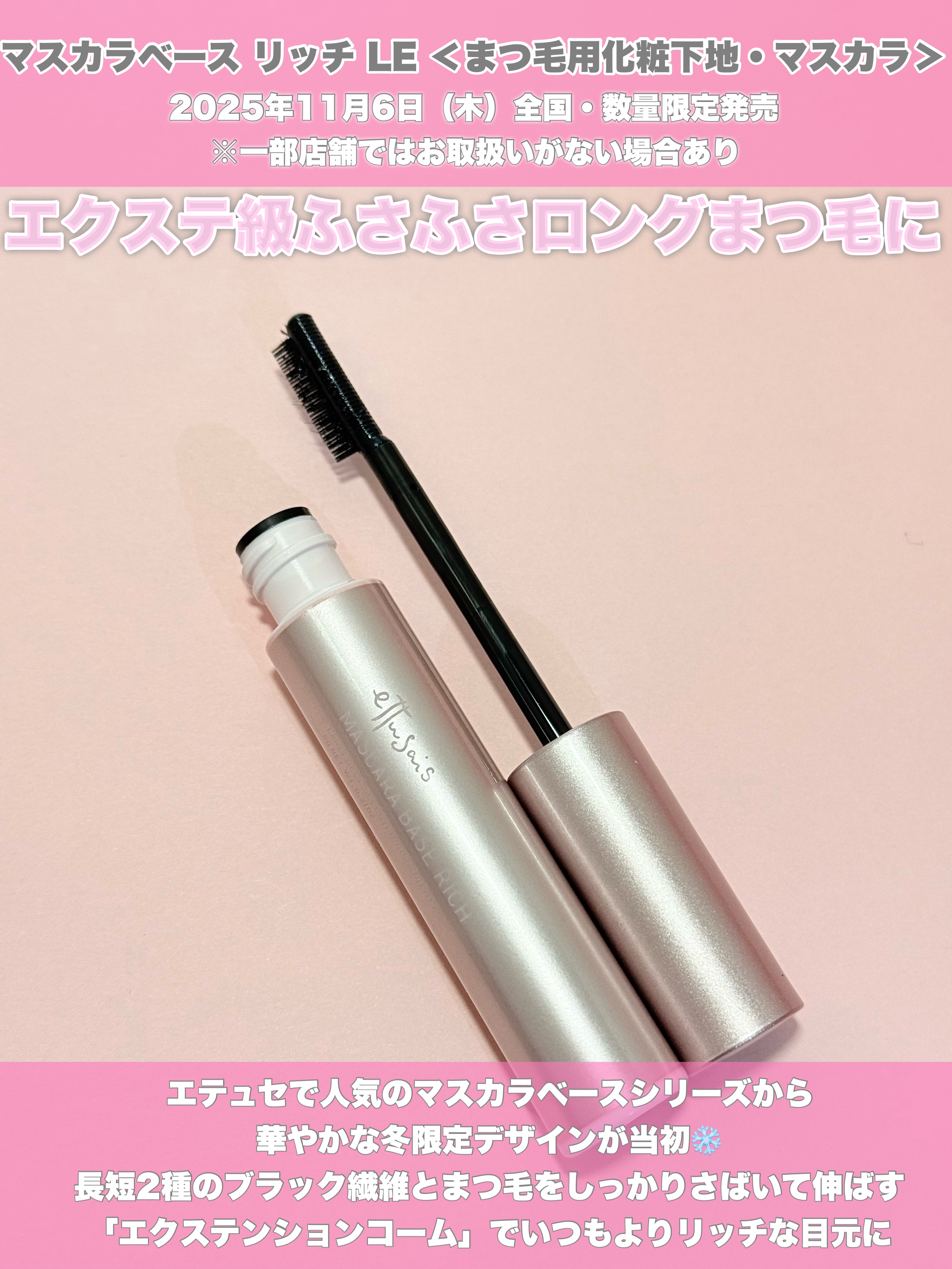 エテュセ2025ウィンターコレクション11/6(木)発売の数量限定*新作レビュー🩷✨️\限定デザインパッケージ/🤍マスカラベースリッチLEマスカラ下地・マスカラ長短2種のブラック繊維入で自まつげが増えたみたいになるよ。ダマにならずに、綺麗に...