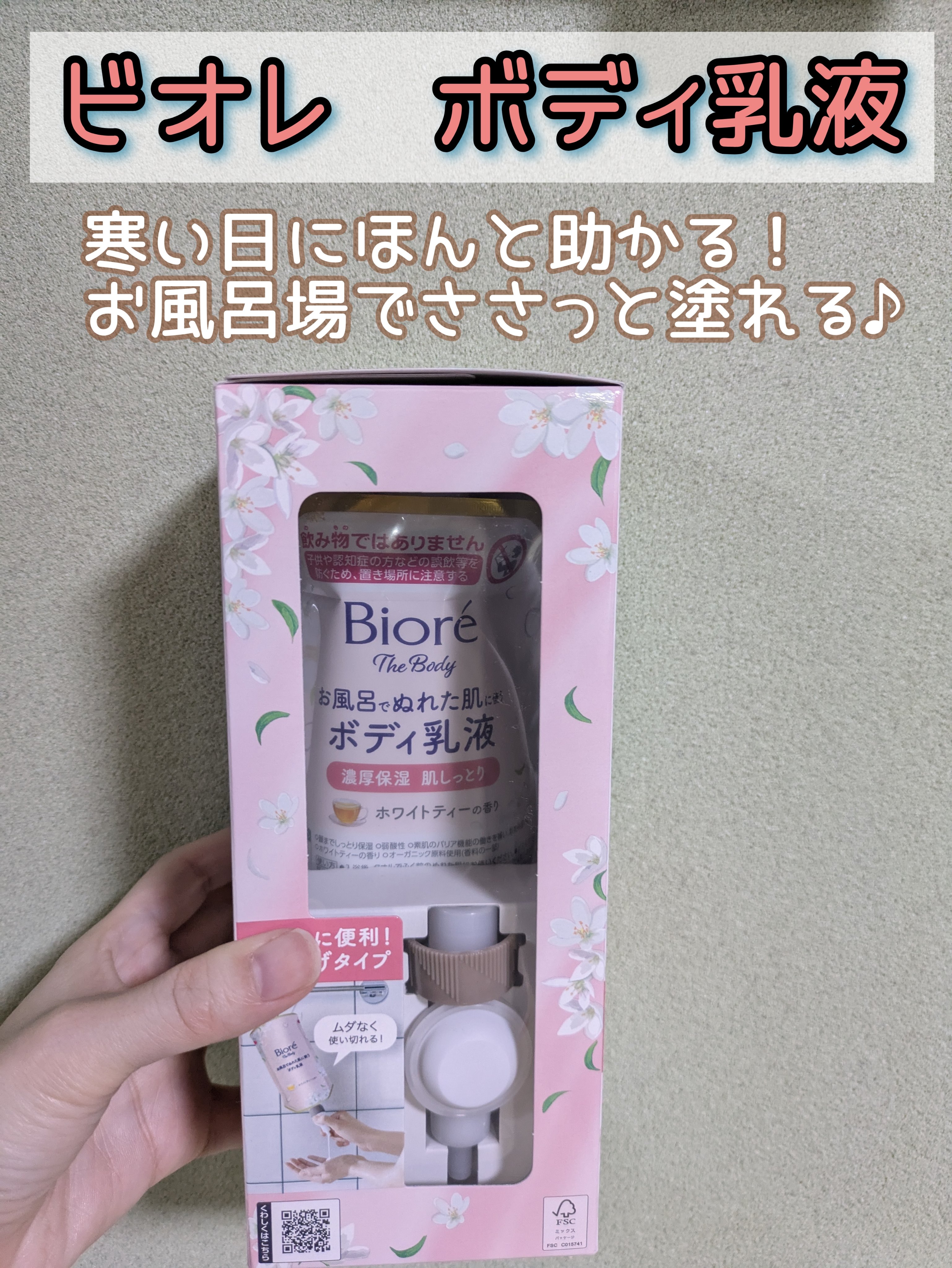 お風呂の中でお手軽にケアビオレザボディお風呂でぬれた肌に使うボディ乳液肌しっとりホワイトティーの香りボディケアはパパっと済ませたいそんな方におすすめの商品です正直保湿力がめちゃくちゃ高くはありませんが、春~秋にはピッタリ何より時短になるのが嬉しいです♡詰替パックをリピート購入しました