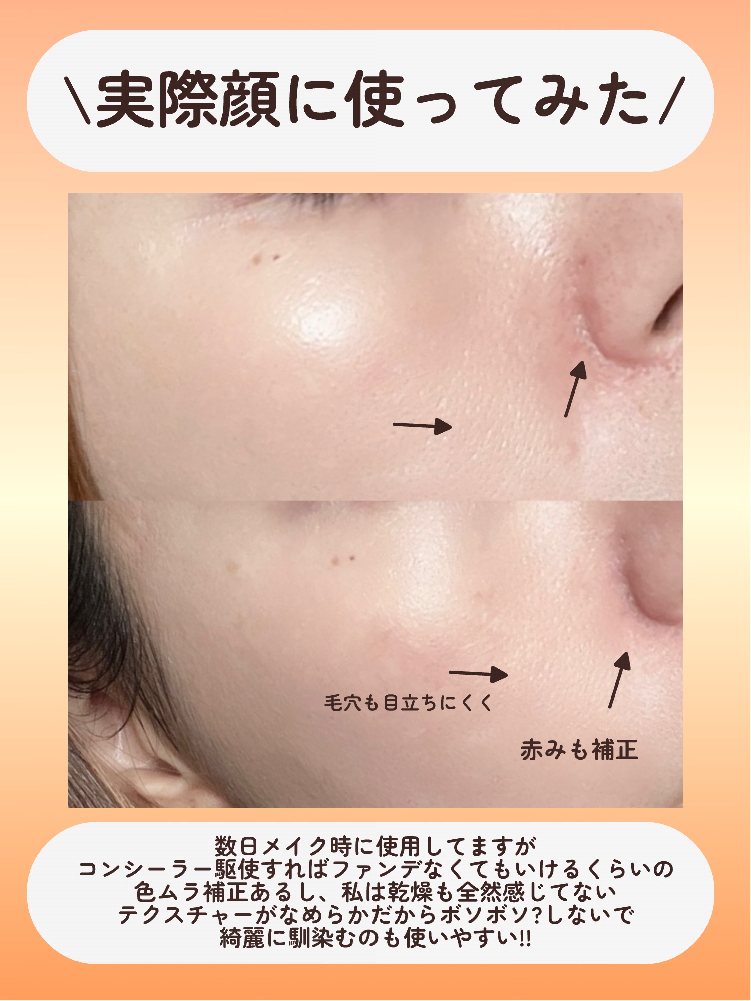 01グロウの通り、塗布すると、肌の色ムラを補正しつつ、濡れたような艶.光沢感✨みずみずしいんだけど、ピタッと密着して留まる感じもあるから、崩れやベタつきは気にならなかった。(乾燥肌です、ご参考までに😇)ファンデはリキッド使用しましたが(RMKです、前ですが載せてます😊)艶感とカバー力のバランスが良いのか頑張ってない、キレイな肌の人って感じの仕上がりです✨(作り込みすぎてないけど、なんか肌キレイな人〜みたいな😅✨)仕上がりもわざとらしくない。(艶々しすぎてないというか、、)このバランス私は好きでした☺️🌈✨下地お探しの方、気になった方は人気の下地のようなので是非にチェックしてみてくださいね😊♡#fwee#下地#人気下地#プラザ購入#乾燥肌#ツヤ#韓国コスメ#スパグロウUVトーンアップベース#アラフォー#コスメ好きさんと繋がりたい
