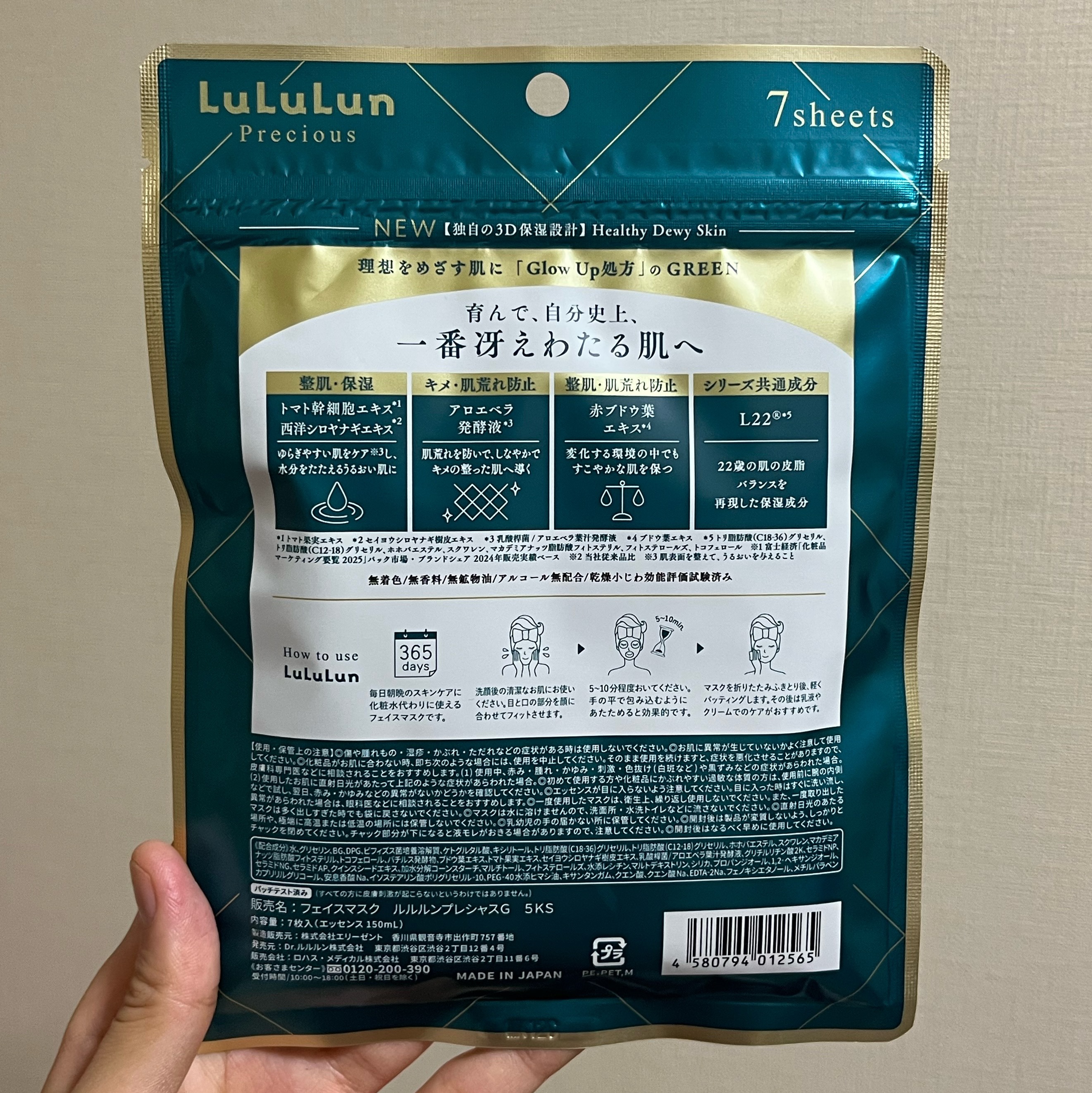 【冴えわたる印象のうるおい肌へ】今回ご紹介するのはこちら🌿『ルルルンプレシャスGREEN(GlowUp)』理想を目指す、すべての肌に。肌全体のコンディションを総合的にサポートするフェイスマスクです。うるおいの構造※1にアプローチする「ヒト型セラミド*1」と肌の調和を保つ「グリチルリチン酸2K*2」を配合。美しい肌の基盤※1を築き、冴えわたる印象のうるおい肌へ。リニューアルし、保湿の設計もアップデート。肌の構造とはたらきを徹底的に分解して、うるおいが満ち続けるためのシステムを考え抜きました。独自の「3D保湿設計」で与えたうるおいを有効活用し、角質層のすみずみまで行き渡らせることで、みずみずしくやわらかな肌をキープします。さらに、シートのふっくら感もUP!※2クッション性となめらかさを高め、ふっくら優しい肌あたりのシートが肌へ吸い付くように密着し、長時間うるおいが続きます。(*1保湿成分セラミドNP、セラミドNG、セラミドAP*2整肌成分※1角質層のこと※2社従来品比)※上記はLIPSより引用(..)"mimiBeautyキャンペーンで当選していただきました!ありがとうございます🙇♀️ルルルンの人気シリーズがリニューアル!シートと保湿感がアップデートされました👏🏻化粧水タイプのフェイスマスク!GREENはGlowUp処方です!高級感のあるパッケージ!チャック付きなので、安心して保管できます!極厚高密着シート!厚手で丈夫なシートです!驚くほど液がひったひたで、袋から取り出すと滴りました💧シートの穴は小さめな印象です!そのままだと目尻にかかって目が開けにくくなるので、私は少しだけ横に引っ張って伸ばして貼っています!口もかなりギリギリで、使用中はほぼ開けられませんでした!縦幅は問題なく、顎先までしっかり覆えるサイズ感です!洗顔後の清潔な肌に5〜10分使用します!液がひたひたで乾きにくいです!剥がした後も、今袋から出したっけ?と思うほどひたひたで(さすがにもう滴らないけど)軽く握っただけで液が絞れました🫢肌はうるおってもっちりしっとり高保湿です!使用後は乳液やクリームなどを塗って肌を整えるのがおすすめです!毎日使って肌のうるおいが長続き🫧乾燥しにくくなり、メイクも崩れにくくなった気がします!とにかくうるおい感が欲しい人におすすめです!よかったら使ってみてね☺︎最後までご覧頂きありがとうございます💍#LuLuLun