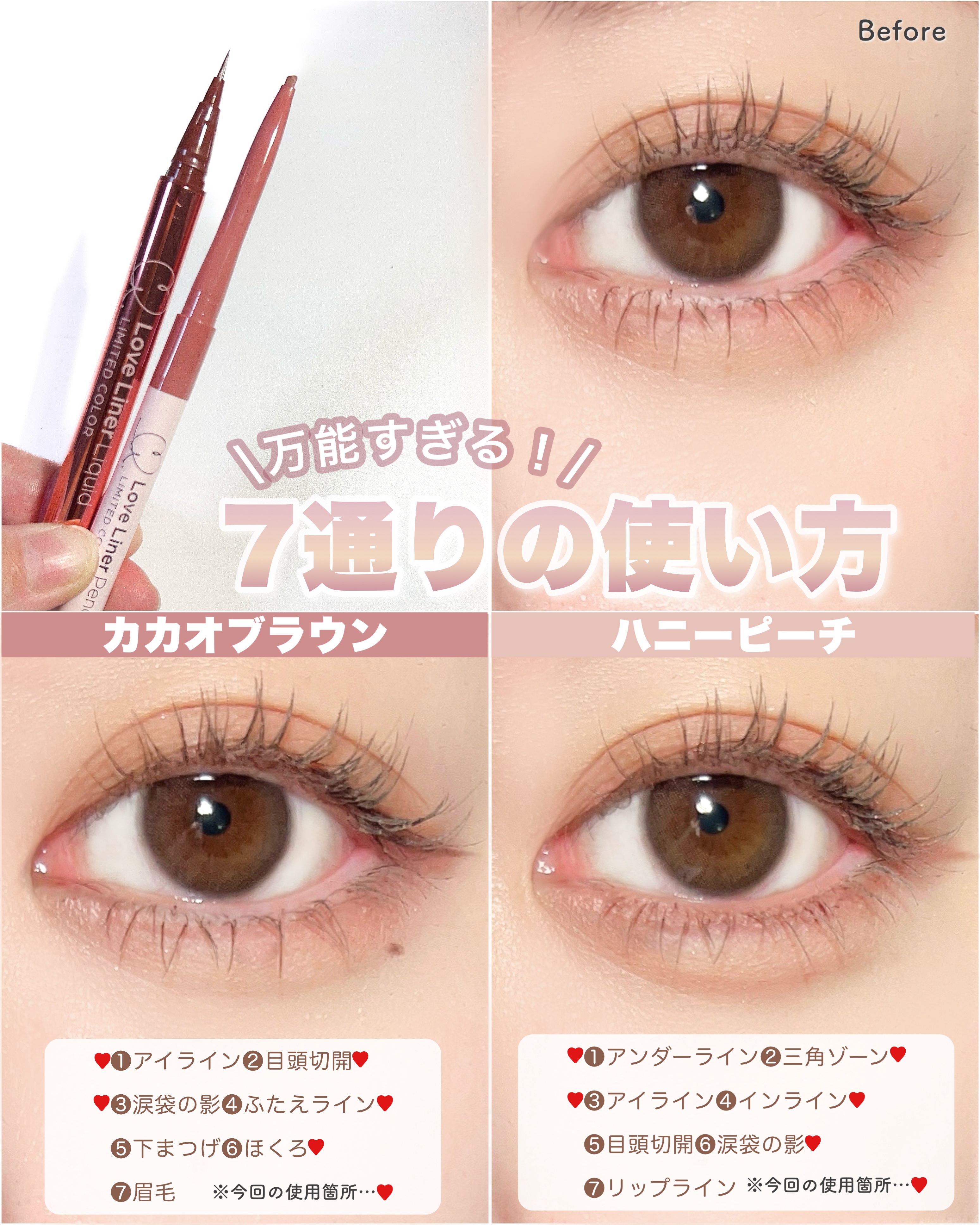 ラブライナー限定色でた🩷🖌️/話題の超極細アイライナーから、粘膜カラーの限定色が登場✨1本で7役とマルチ使いできて、爆盛れしちゃうよ🥹✨◾️ラブ・ライナー リキッドアイライナーR5 極細筆 カカオブラウン価格:税込1,760円(税抜1,600円)◾️ラブ・ライナー クリームフィットペンシルR 極細楕円芯 ハニーピーチ価格:税込1,320円(税抜1,200円)中顔面短縮、目幅拡張など、1本7役でバレずに自分好みのデカ目を叶える「トリックアイライナー」🖌️🥹どちらも肌馴染みの良いカラバリなので、ナチュラルにあざとく詐欺メイクを楽しむことができるよ☺️💖✔︎リキッドアイライナー・筆先0.01mmと超極細で、目尻まで綺麗に描ける✨・アルミボトルの重みで手元が安定して手振れを防ぐよ🖌️・ほどよい透け発色✨絶妙なカラーでメイク馴染み抜群👌🍫カカオブラウン・・・自然な陰影を演出する透け発色のニュアンスブラウン✔︎ペンシルアイライナー・1.1mmの超極細楕円芯で、ペンシルなのに細かいところもきれいに描けるよ🥹・なめらかな描き心地なのに、12時間にじまない*(描いてすぐはぼかすこともでき、20秒後にピタッと定着)・アンダーラインに使いやすくナチュラルに盛れる✨🍯🍑ハニーピーチ・・・目元にほんのり血色感を与えるソフトなピンクベージュ*msh調べ。効果には個人差があります。..どちらも肌馴染みの良いカラーでメイクに溶け込んでくれるし、影色にもなるから万能に使えてとっても便利🥹🩷1本持っておくとかなり重宝するよ✨📢販売場所🛒WEB:msh公式オンラインストア、msh公式楽天ストア、msh公式アマゾン、msh公式Qoo10ストア🛍️店頭:全国のバラエティショップ、ドラッグストア ※店舗により発売時期が異なり、一部お取り扱いのない店舗がございます。今だけの限定なので気になった方はお早めにチェックしてね🔍✨@loveliner_official#PR#ラブライナー#loveliner#ラブライナーリキッド#ラブライナーペンシル#トリックアイライナー#アイライナー