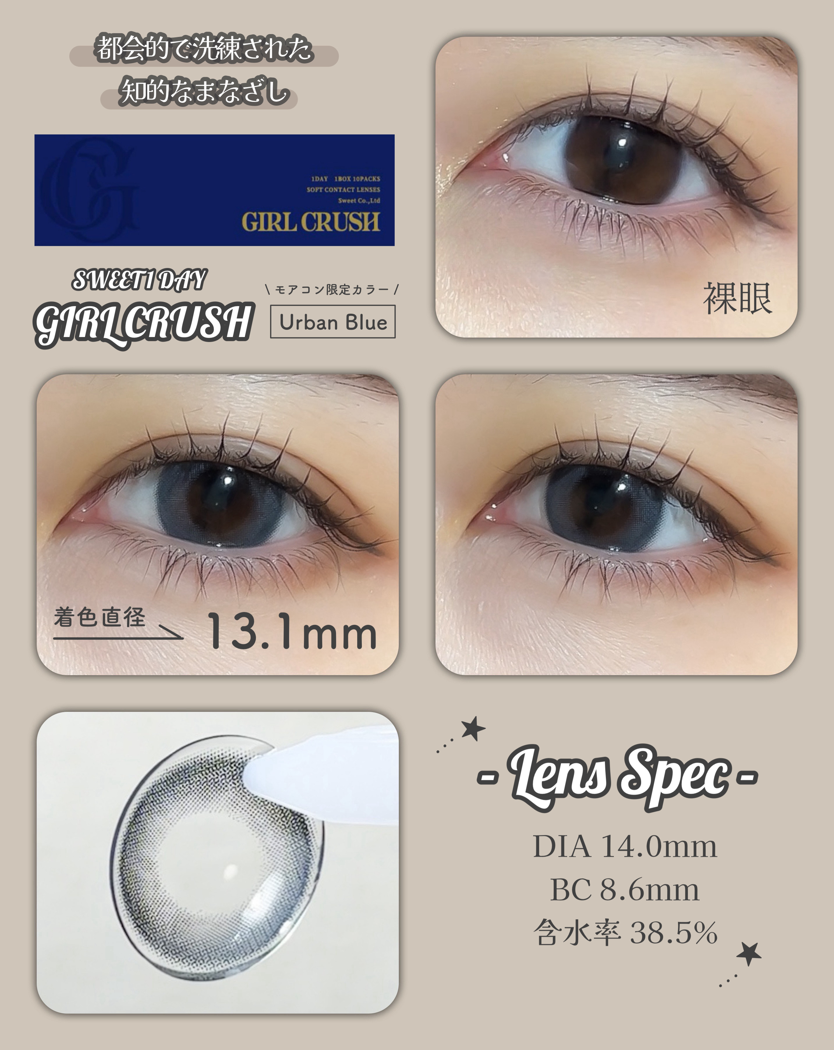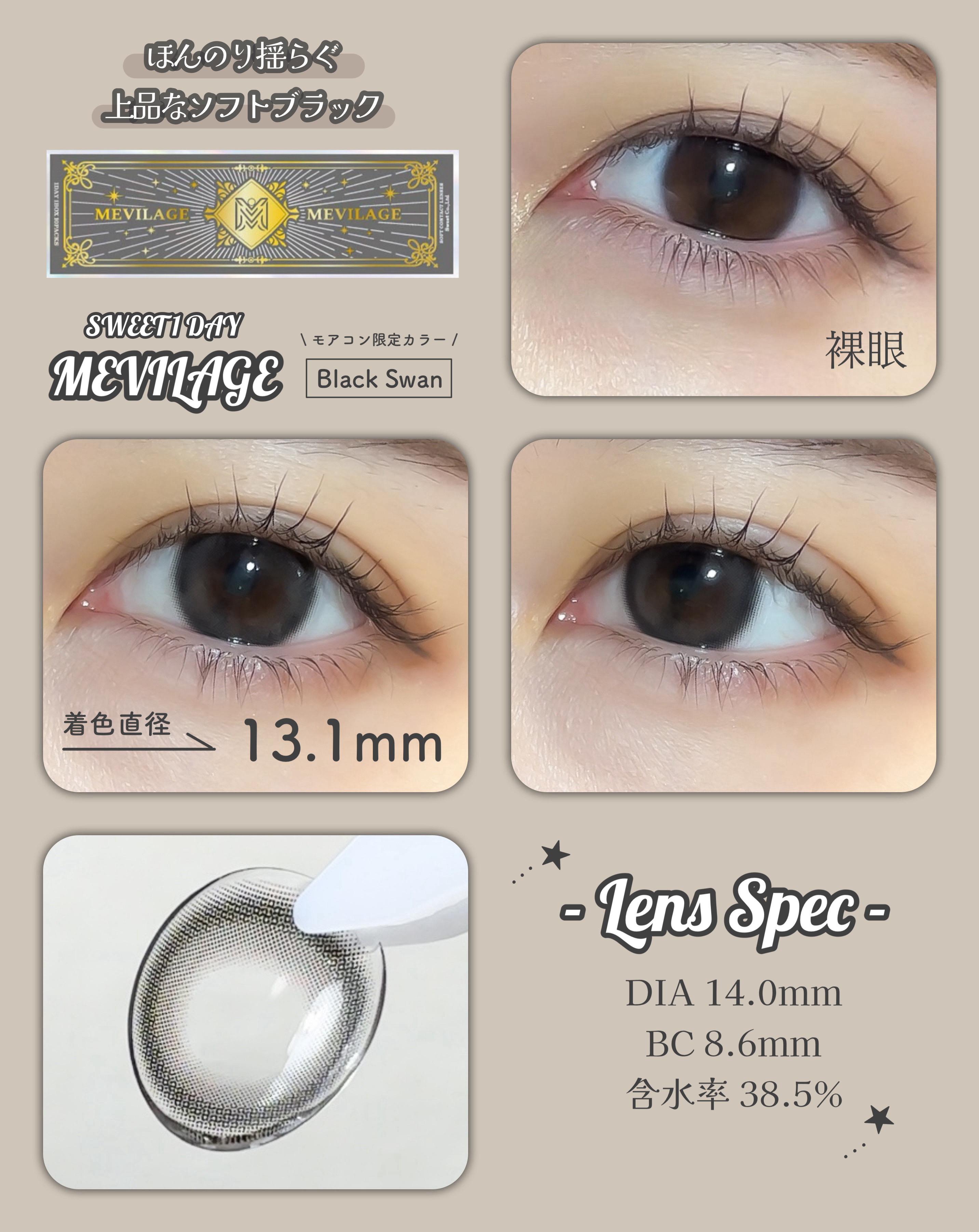 瞳に溶け込み洗練された目元スウィートメビラージュ1day BlackSwanラディリス1day EtoileBeigeガールクラッシュ1day UrbanBlueスウィート1dayカラコンの新作はモアコンタクト限定の3色どれも瞳に溶け込みなが...