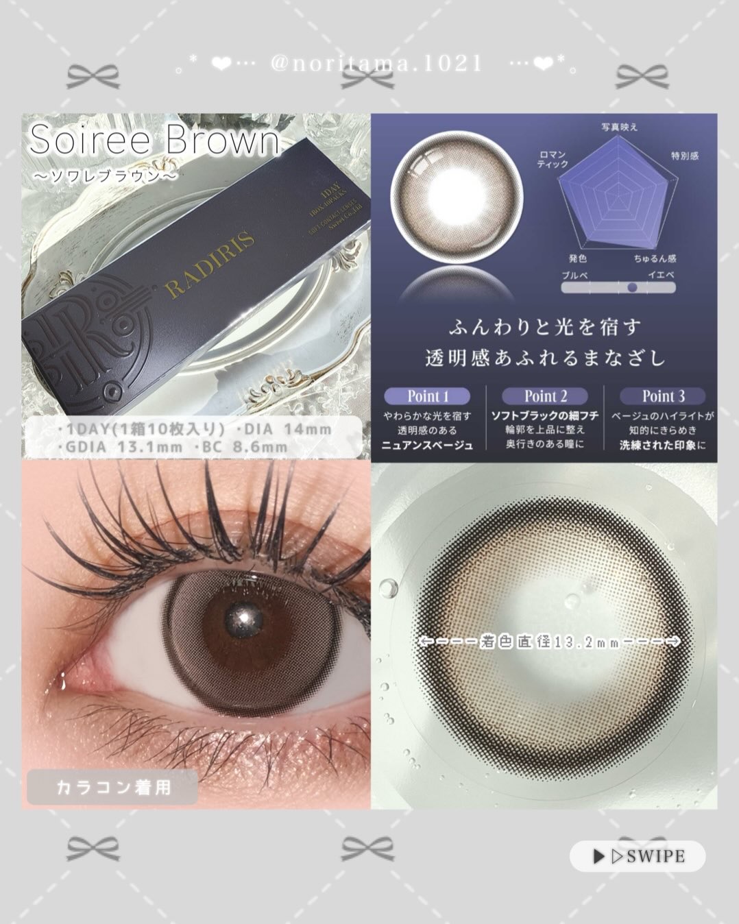 TWICEのサナさんがモデルをつとめるカラコン🪄ྀི「どんな時も自分自身が主役」をコンセプトにまなざしに自信をくれるブランドRADIRIS(ラディリス)🧸ིྀ今回私が使ったのはエレガントグロウ、ソワレブラウン、ドロップアンバーの3色だよ🫶光を取り込む透明感あふれる上品なデザインと着け心地のよさがお気に入り😍気になった方は公式さん@radiris_officialをチェックしてみてください😊#ラディリス#radiris#スウィート#pr#ok_sweet