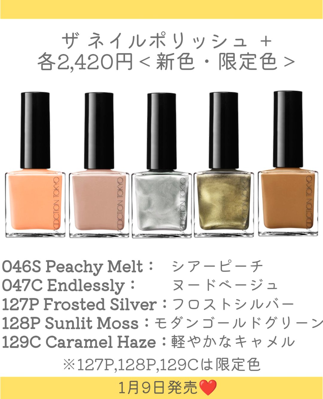 新作コスメ˗ˏˋꪔᥱꪔ᥆ᝰ✍︎ˎˊ˗❁.˚‧º‧┈┈┈┈┈┈┈┈┈‧º·˚.❁ADDICTION春コスメ❁.˚‧º‧┈┈┈┈┈┈┈┈┈‧º·˚.❁2025年12月26日(金)予約開始2026年1月9日(金)発売❁*·⑅❁*·⑅❁*·⑅❁*·⑅❁*·⑅❁*·❁*·⑅❁*·⑅❁*𖤐アディクションザシングルアイシャドウスパークル限定色¥2,530101SPStreetMirageグリーンパールが輝くストリートなベージュ❁*·⑅❁*·⑅❁*·⑅❁*·⑅❁*·⑅❁*·❁*·⑅❁*·⑅❁*𖤐アディクションザシングルアイシャドウパール限定色¥2,530101PSundayNoon光と影を仕込むスキンベージュ102PSunriseWindow朝の光を透かすヘルシーオレンジ103PAftertheDream夢の余韻のようなシックなピンク104PSmokyTaupeモーヴニュアンスのビターなトープ105PBreezyCamelエフォートレスで軽やかなキャメル106PGoldenSepiaエレガントに輝くセピアブラウン❁*·⑅❁*·⑅❁*·⑅❁*·⑅❁*·⑅❁*·❁*·⑅❁*·⑅❁*𖤐アディクションザシングルアイシャドウネイキッドシアー限定色¥2,530101NLikeSmoke薄い煙のようなスモーキーグレー102NInnerDepthモーヴが潜むチャコールグレー103NThroughtheFilter自然な立体感を生むオリーブベージュ❁*·⑅❁*·⑅❁*·⑅❁*·⑅❁*·⑅❁*·❁*·⑅❁*·⑅❁*𖤐アディクションザジェルアイライナー限定色¥3,300101LeatherOrangeカジュアルな印象のオレンジブラウン102CoolMahogany凛とした色気が漂うモーヴブラウン103DarkCinnamon温かみと抜け感のあるシナモンブラウン❁*·⑅❁*·⑅❁*·⑅❁*·⑅❁*·⑅❁*·❁*·⑅❁*·⑅❁*𖤐アディクションアイブロウマスカラカラーニュアンス限定色¥3,300101AlmondBeige赤みのくすみベージュ102LatteBlonde明るい黄みのくすみベージュ❁*·⑅❁*·⑅❁*·⑅❁*·⑅❁*·⑅❁*·❁*·⑅❁*·⑅❁*𖤐アディクションザネイルポリッシュ+新色・限定色¥2,420046SPeachyMelt(新色)ヘルシーな血色感のシアーピーチ047CEndlessly(新色)どこまでも溶け込むヌードベージュ127PFrostedSilver(限定色)繊細に煌めくフロストシルバー128PSunlitMoss(限定色)光を帯びたモダンなゴールドグリーン129CCaramelHaze(限定色)霧がかったような軽やかなキャメル❁*·⑅❁*·⑅❁*·⑅❁*·⑅❁*·⑅❁*·❁*·⑅❁*·⑅❁*𖤐アディクションザネイルオイルセラム¥2,970大地を思わせるハーバル&ウッディの香り癒されながら、甘皮やハイポニキウムをやさしくケアできる❁*·⑅❁*·⑅❁*·⑅❁*·⑅❁*·⑅❁*·❁*·⑅❁*·⑅❁*春色・限定色気になりますᝰ✍🏻̖́-#ADDICTION