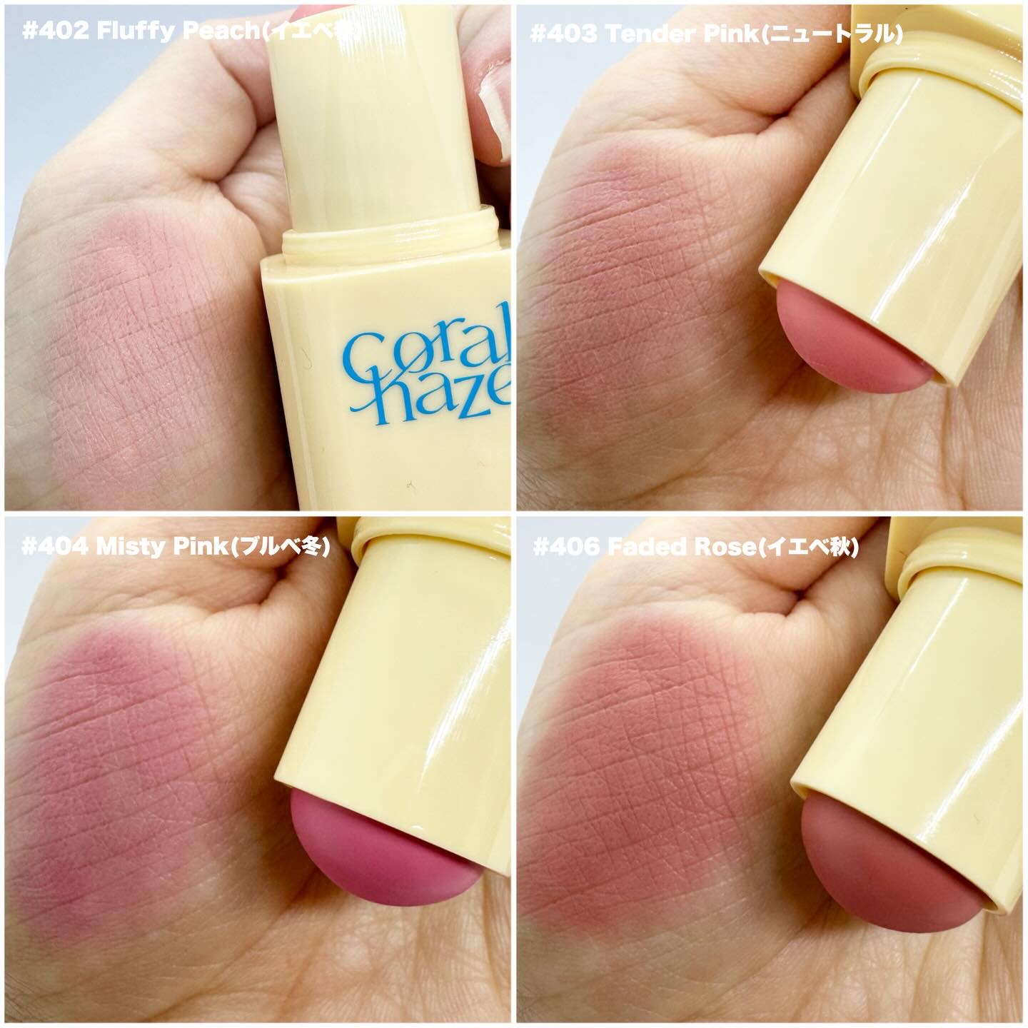 バターみたいにとろける質感とじゅわっと内側からにじむ血色感を演出する😍発色は控えめで、重ね使いしても可愛い🩷マットめな質感でリップにもチークにも使えるけど主張しすぎないところが使いやすい✨香りは甘めだから苦手な人は注意かも⚠️ブルベのわたしは404がお気に入り❣️【PR】#コーラルヘイズ@coralhaze_jp