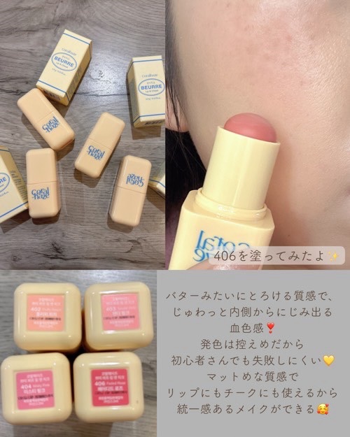 バターみたいにとろける質感とじゅわっと内側からにじむ血色感を演出する😍発色は控えめで、重ね使いしても可愛い🩷マットめな質感でリップにもチークにも使えるけど主張しすぎないところが使いやすい✨香りは甘めだから苦手な人は注意かも⚠️ブルベのわたしは404がお気に入り❣️【PR】#コーラルヘイズ@coralhaze_jp