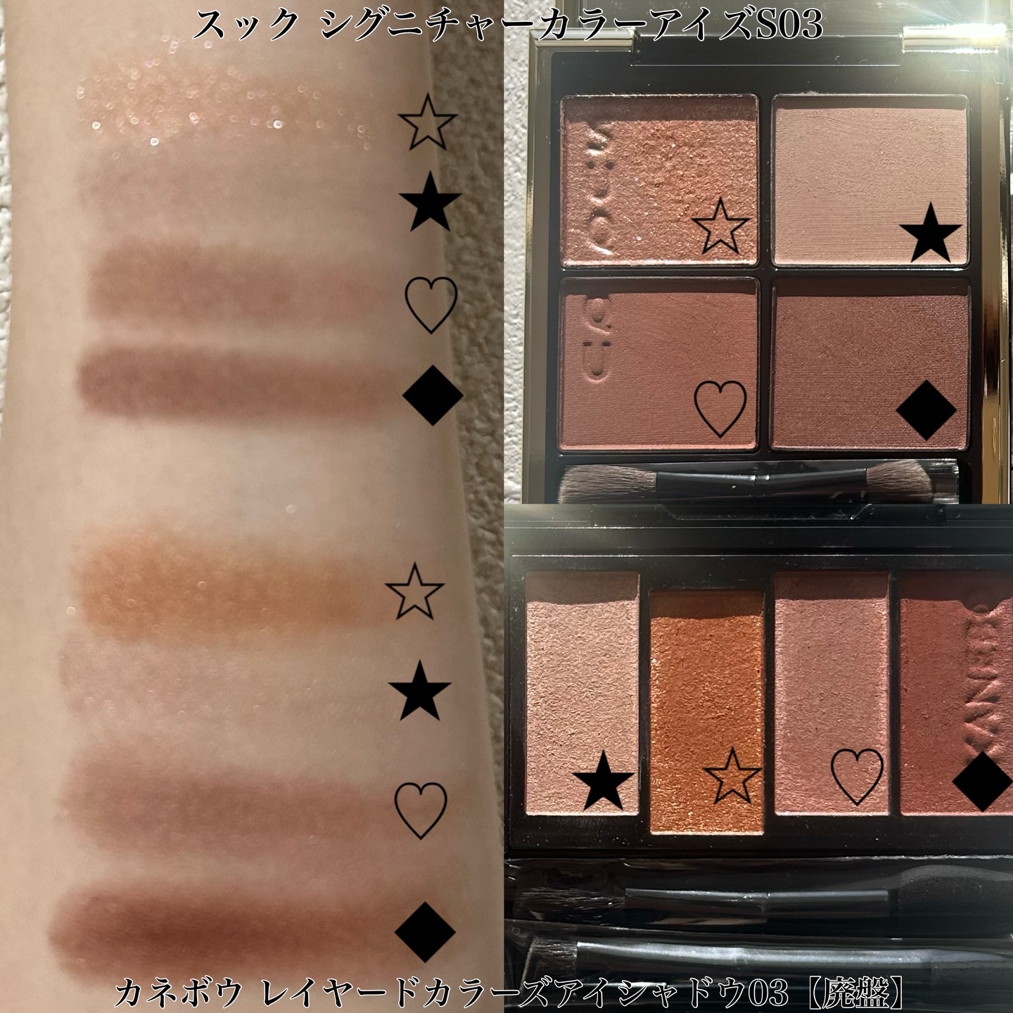 【SUQQU】✔️デザイニングカラーアイズS03霜花赤みブラウンがシックで惹かれたこちら…マット3色にラメが1色と潔い配色なのも好きです!甘艶のラメを控えめにしてくすませた感じかなーとおもいつつなんか外視感あるなと思ったら廃盤になったカネボウ...