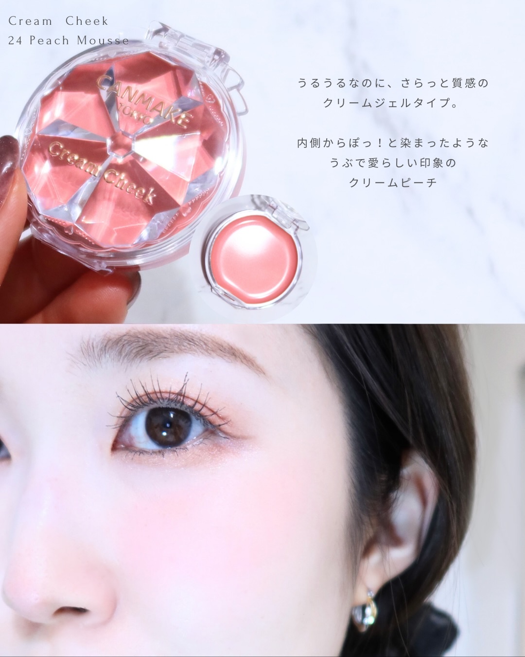 MimiBeautyのpost見て絶対買おうと思ってたキャンメイクのクリームチーク新色24番ピーチムース♡パケがクリスタルのお花みたいに見えて可愛い!色味は若干白みを含んだピーチピンク🍑この色めっっちゃ可愛い🥹これイエベ春爆盛れするやつだわ。#MimiBeauty買い #2026年初買いアイテム