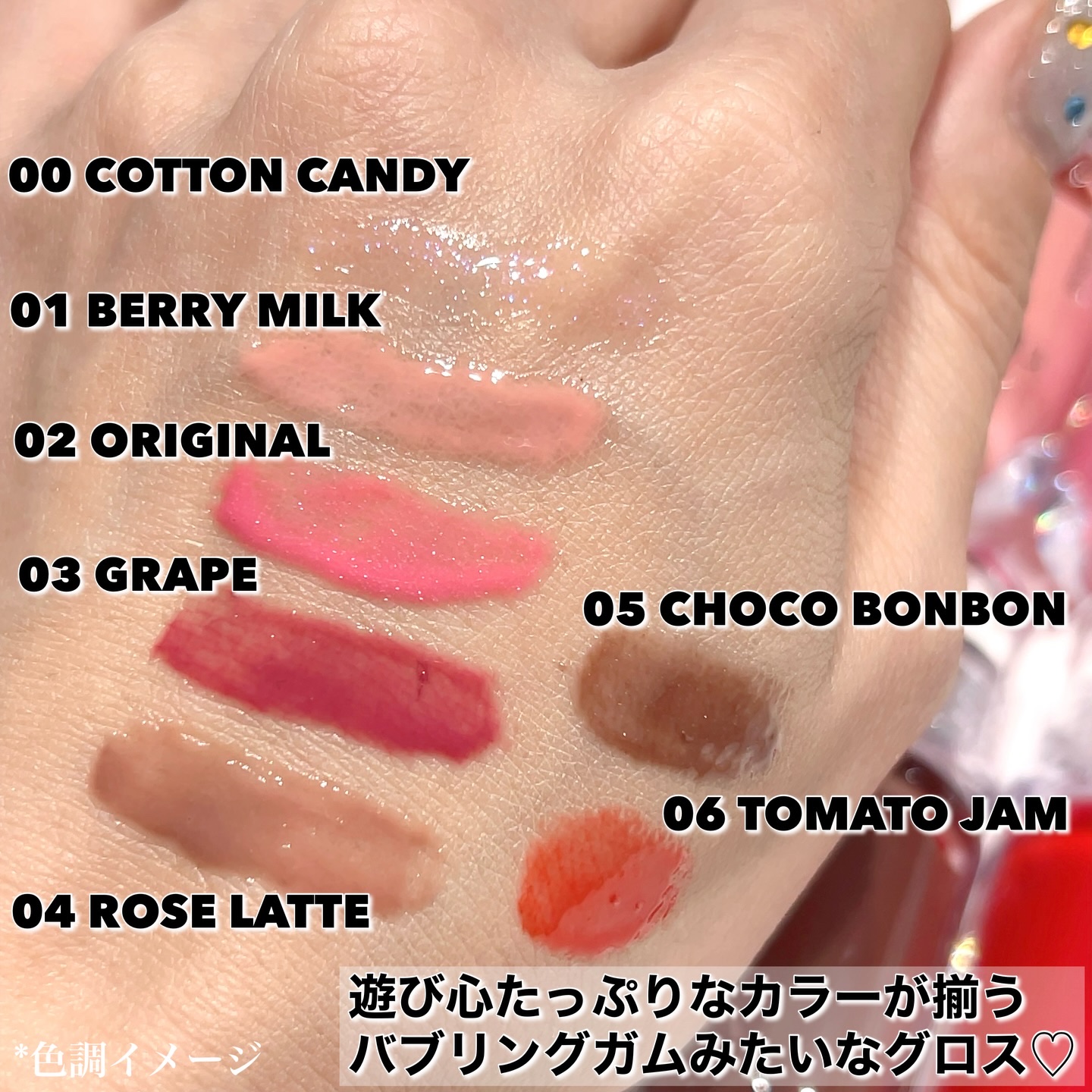 #PR#supportedbyLUNALUNAバブルリングガムグロス「フーセンのようにぷるんガムのようにもっちり」がコンセプトの新商品!00CottonCandy☁️🍬ブルベ夏/ブルベ冬01BerryMilk🍓🥛イエベ春/イエベ秋02Orig...