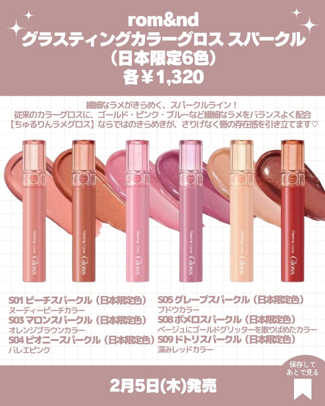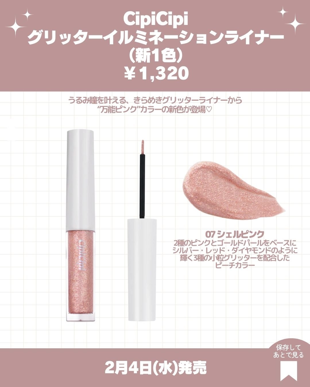 話題の新作コスメ最新情報まとめ~!こんにちは!kumasakuです🐻@ckumacom▲過去の投稿はここからチェック!今回も新作コスメの最新情報をまとめて紹介します!保存して欲しい新作コスメを見逃さないように🐻【ご紹介アイテム】■1月28日(水)発売→#muice(#ミュアイス)「ピンクコレクション【第一弾】」・ぽわんチーク(限定1色)¥990SP03キャンディピンク(限定色)・うるみハイライター(限定1色)¥968SP01ミミピンク(限定色)■2月4日(水)発売→#CipiCipi(#シピシピ)・リップセラム R¥990・グリッターイルミネーションライナー(新1色)¥1,32007シェルピンク■2月5日(木)発売→rom&nd(#ロムアンド)・グラスティングカラーグロススパークル(日本限定6色)各¥1,320S01ピーチスパークル(日本限定色)S03マロンスパークル(日本限定色)S04ピオニースパークル(日本限定色)S05グレープスパークル(日本限定色)S08ポメロスパークル(日本限定色)S09ドトリスパークル(日本限定色)■2月18日(水)発売→#Wonjungyo(#ウォンジョンヨ)・Wデイリームードアップパレット(新1種)¥2,42005ピーチモカ・アーティストタッチブラシ(新2種)#04¥1,045#05¥990次回も話題の新作コスメの最新情報などご紹介しますのでお楽しみに!------------------------------------※画像はLIPS様よりお借りしました。#新作コスメ#コスメカレンダー#コスメ情報#コスメ紹介#韓国コスメ#韓国コスメ新作#プチプラ#プチプラコスメ#プチプラ新作#ドラコス#ドラスト#バズ#バズコスメ#バズりコスメ#新作#新色#限定色#限定品#春コスメ#メイクアップ#おすすめ新作#限定#春メイク#ピンクメイク#ピンクコスメ#垢抜け#垢抜けメイク#パケ買い#パケ買いコスメ#チーク#ブラッシュ#桜コスメ#血色感#ハイライター#多幸感#リップケア#リップ美容液#リップセラム#アイライナー#グリッターライナー#リップ#ティント#ティントリップ#リップティント#グロス#リップグロス#アイシャドウ#チークパレット#アイカラー#涙袋#涙袋メイク#メイクブラシ