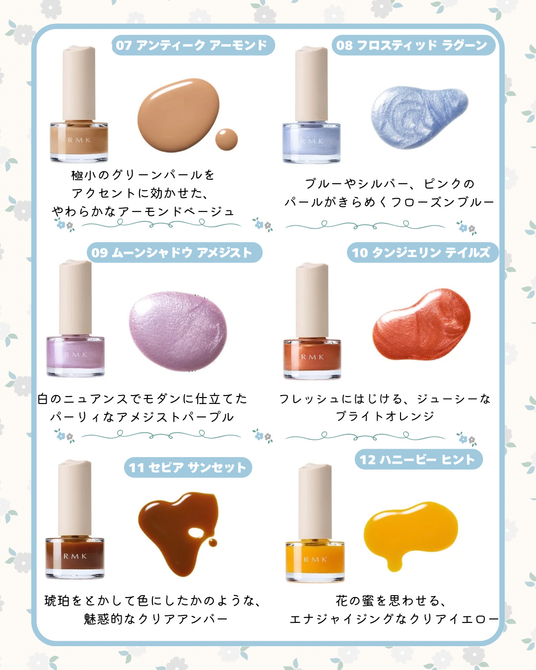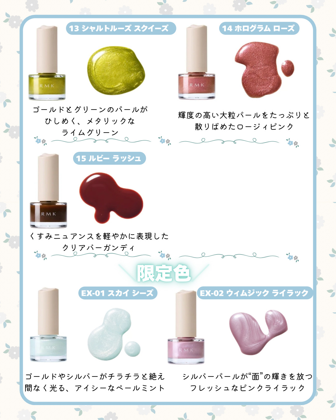 新作コスメ˗ˏˋꪔᥱꪔ᥆ᝰ✍︎ˎˊ˗❁.˚‧º‧┈┈┈┈┈┈┈┈┈‧º·˚.❁RMK2026年夏ネイル❁.˚‧º‧┈┈┈┈┈┈┈┈┈‧º·˚.❁RMK シャインラッシュネイルカラー¥2,2002026年4月3日(金)発売❁*·⑅❁*·⑅❁*·⑅❁*·⑅❁*·⑅❁*·❁*·⑅❁*·⑅❁*⋆透明感あふれるグロウな艶めきと、ありそうでなかった絶妙なカラーリング⋆個性豊かで気分の高まる全17色❁*·⑅❁*·⑅❁*·⑅❁*·⑅❁*·⑅❁*·❁*·⑅❁*·⑅❁*𖤐RMKネイルベースコート¥2,200𖤐RMKグロッシートップコート¥2,200❁*·⑅❁*·⑅❁*·⑅❁*·⑅❁*·⑅❁*·❁*·⑅❁*·⑅❁*限定カラーが可愛いᝰ✍🏻̖́-#RMK#RMKシャインラッシュネイルカラー