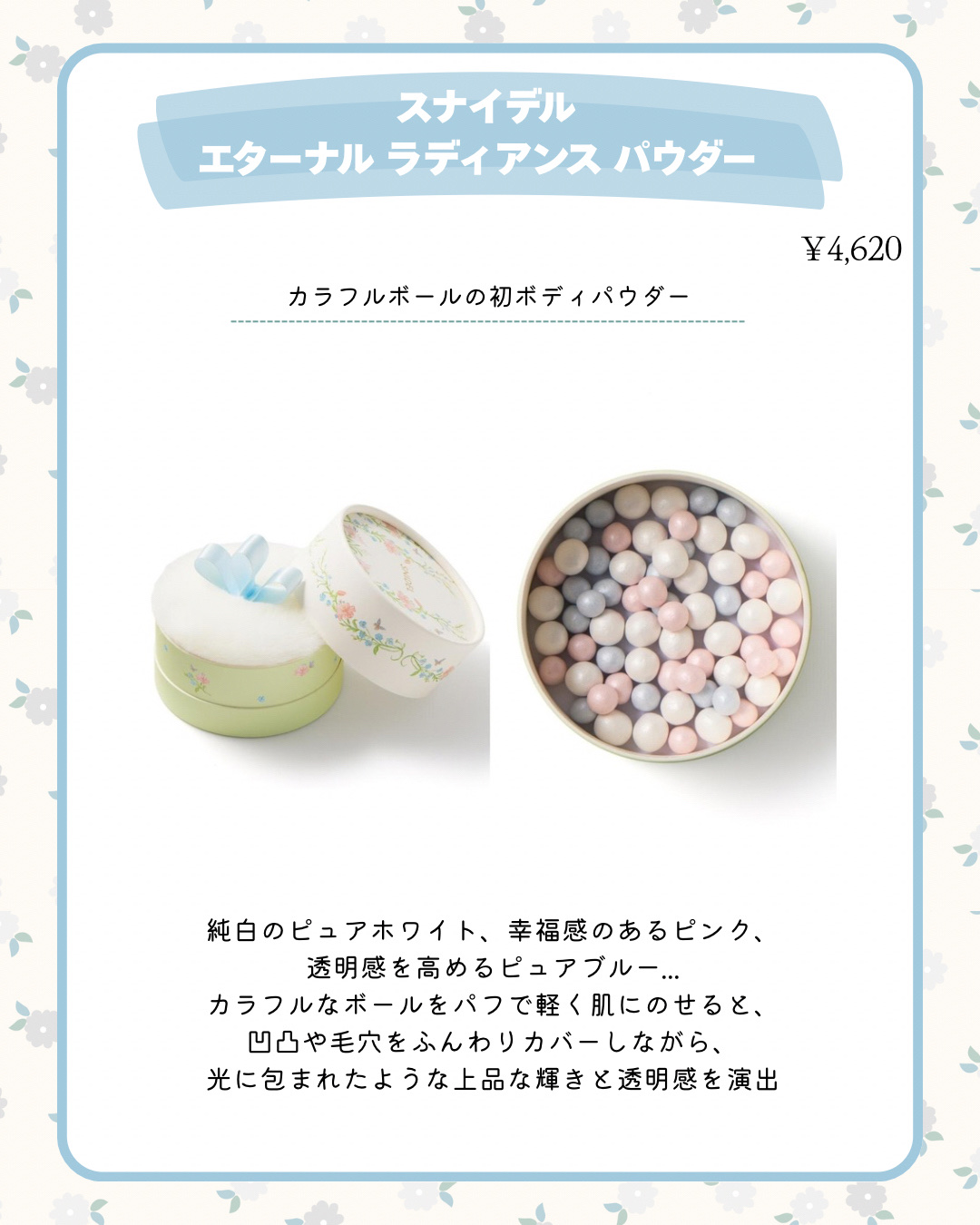 新作コスメ˗ˏˋꪔᥱꪔ᥆ᝰ✍︎ˎˊ˗❁.˚‧º‧┈┈┈┈┈┈┈┈┈‧º·˚.❁SNIDELBEAUTY2026年春コスメ❁.˚‧º‧┈┈┈┈┈┈┈┈┈‧º·˚.❁2026年2月17日(火)予約開始3月3日(火)全国発売❁*·⑅❁*·⑅❁*·⑅❁*·⑅❁*·⑅❁*·❁*·⑅❁*·⑅❁*スナイデルアイデザイナーn¥6,600⋆07SweetestMoment初回限定パッケージ輝きをそっと添える王道ベージュパレットやわらかな陰影カラーにブルーのニュアンスが重なり、奥行きのある目元と多幸感を演出⋆EX04MyLover阪急うめだ本店限定色花束のようにロマンティックなカラーパレットラスターピンクやパステルグリーン、モーヴベージュ、パールブラウンなど、花々を思わせる色彩と煌めきで、まぶたを華やかに彩る⋆EX05MisstoMrs.ルミネ新宿2店/ルミネ有楽町店限定色赤みニュアンスのカラーパレット幸福感のあるレッドブラウンやレッドベージュに、光を差し込むようなホワイトをセットし、印象的な眼差しに❁*·⑅❁*·⑅❁*·⑅❁*·⑅❁*·⑅❁*·❁*·⑅❁*·⑅❁*スナイデルルージュクチュールコフレ¥4,400<限定品>⋆EX11ModernBrideミルキーなブライトピンクピュアな発色とうるツヤ質感で、可憐ながらフレッシュな印象に⋆EX12SparklingNight穏やかな血色をもたらすレッドベージュ肌に溶け込むようになじみ、表情に温もりと愛らしさをプラスする❁*·⑅❁*·⑅❁*·⑅❁*·⑅❁*·⑅❁*·❁*·⑅❁*·⑅❁*スナイデルユーフォリックグロウブラッシュ¥3,300⋆EX04GlowingVeilウェディングヴェールのようなハイライトカラー微かなピンクと煌びやかなパールで、肌にピュアな輝きをオン⋆EX05SweetEndingシアーなスイートピンクふんわりと喜びを宿したような頬を演出する、ソフトマットな仕上がり❁*·⑅❁*·⑅❁*·⑅❁*·⑅❁*·⑅❁*·❁*·⑅❁*·⑅❁*スナイデルエターナルラディアンスパウダー¥4,620純白のピュアホワイト、幸福感のあるピンク、透明感を高めるピュアブルー...カラフルなボールをパフで軽く肌にのせると、凹凸や毛穴をふんわりカバーしながら、光に包まれたような上品な輝きと透明感を演出❁*·⑅❁*·⑅❁*·⑅❁*·⑅❁*·⑅❁*·❁*·⑅❁*·⑅❁*パステルカラーの花柄パケ可愛いᝰ✍🏻̖́-#SNIDELBEAUTY