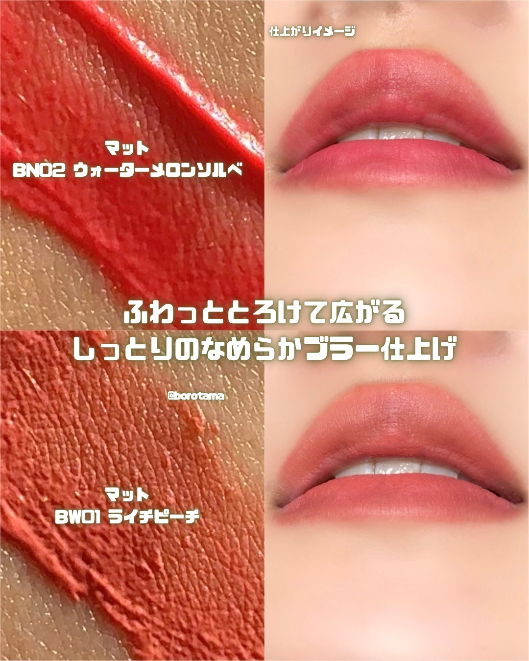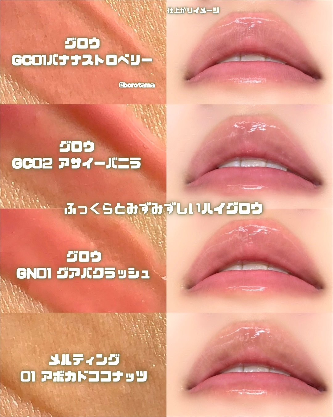 🍹fwee新作 唇の水分補給!?スムージーリップ fwee グロウスムージーリップバーム🍹バズを量産し続けるfweeからリップケアも兼ねたスムージー発想の新作が2/1より登場するので先行レビュー!🍎彩り豊かなスムージーカラー&フレーバーでジューシーな血色感が可愛すぎる…!━━━━━━━━━━ぷるんと仕上がりのグロウと唇のUVケアができるメルティングふわっととろけるマットテクスチャーの3タイプグロウの特徴▼▼🍌ぷるんと水分ツヤでうるおいチャージ!ふっくらとみずみずしいハイグロウメルティングの特徴▼▼🥑SPF20PA+++で唇にまとう紫外線シールド🥑アボカド&ココナッツオイル配合でぷるんと保湿マットの特徴▼▼🍑ふわっととろけて広がるしっとりのなめらかブラー仕上げ🍑唇に心地よく密着するブラーリップバーム━━━━━━━━━━スウォッチカラーはこちら📷グロウ♡GC01バナナストロベリー ♡GC02アサイーバニラ♡GN02フレッシュベリーメルティング♡01アボカドココナッツマット♡BN02ウォーターメロンソルベ♡BW01ライチピーチ━━━━━━━━━━使ってみて✏︎なめらか〜〜〜〜リップカサカサ民の私に嬉しい大変ちゅるんとした使い心地スムージーのようなフルーティなカラバリもかわいいです🫶🏻私のスウォッチ力がないせいでグロウの3色が同じ色に見えるのは許してって感じ。まぁ体感もぶっちゃけこの3色はあんま変わらんと思いましたが。バームだけど発色が良くてそしてとにかく保湿感がすごいっす!グロウは透明感と艶感のあるぷるぷる仕上がりマットはふわっと染まってベルベットな仕上がり特に私はマットの密着力としっとりさに感動しましたね。落ちにくいしうるおいもちゃんとある…!グロウは潤い特化で色落ちはするかなという印象でした。保湿感はグロウのほうが長持ちです◎そしてメルティングはカラーは一色だけ。保湿と唇のUVケアができるというプラスアルファ的アイテムナイトケアにしてもよし、他のリップのベースに塗っても上から重ねてもよし。個人的にマットにメルティングを重ねるとめちゃくちゃかわいいのでおすすめです🙌🏻Qoo10での発売は2/1から!チェックしてみてね🛒#PR#fwee#グロウスムージーリップバーム#新作コスメ#フィー