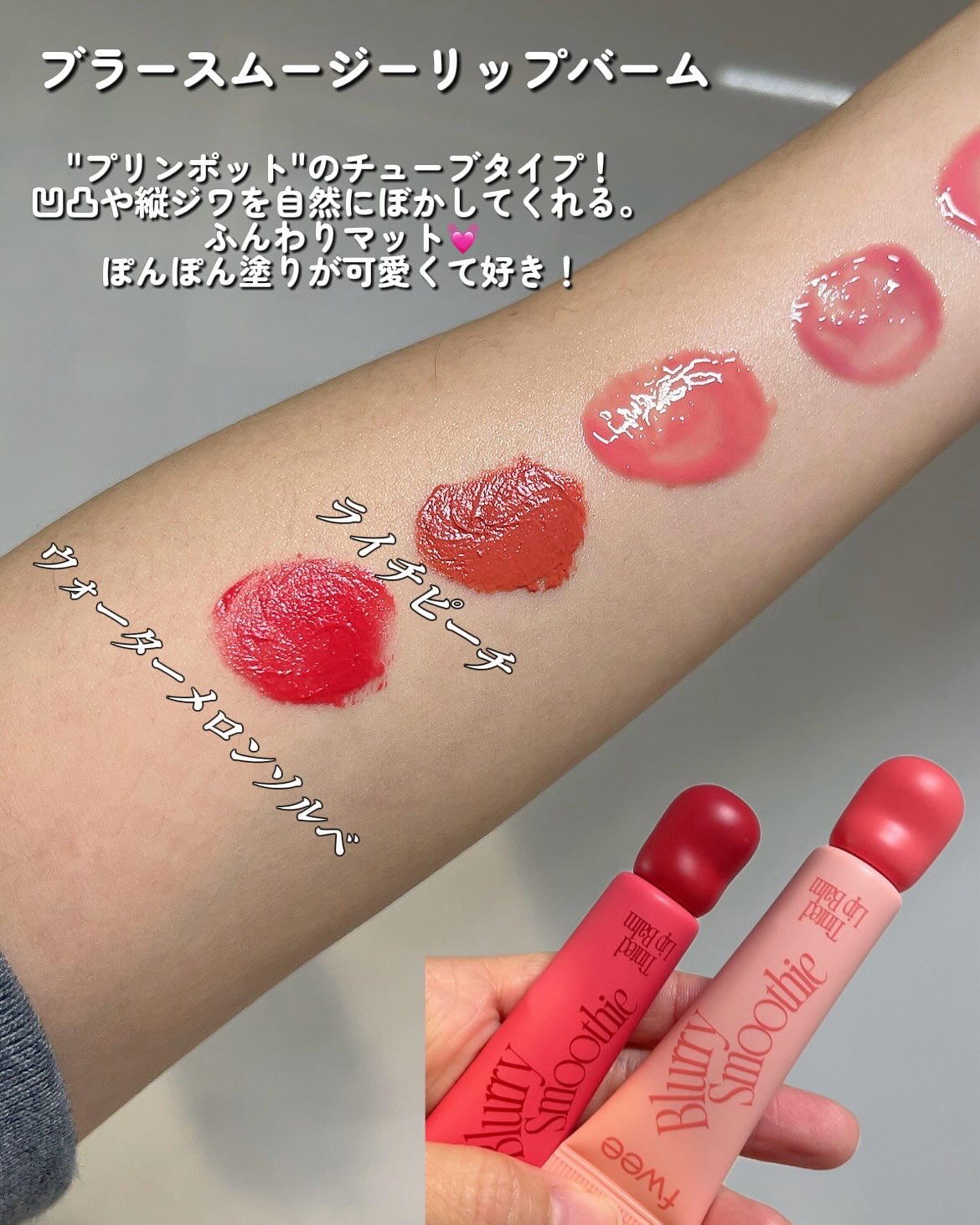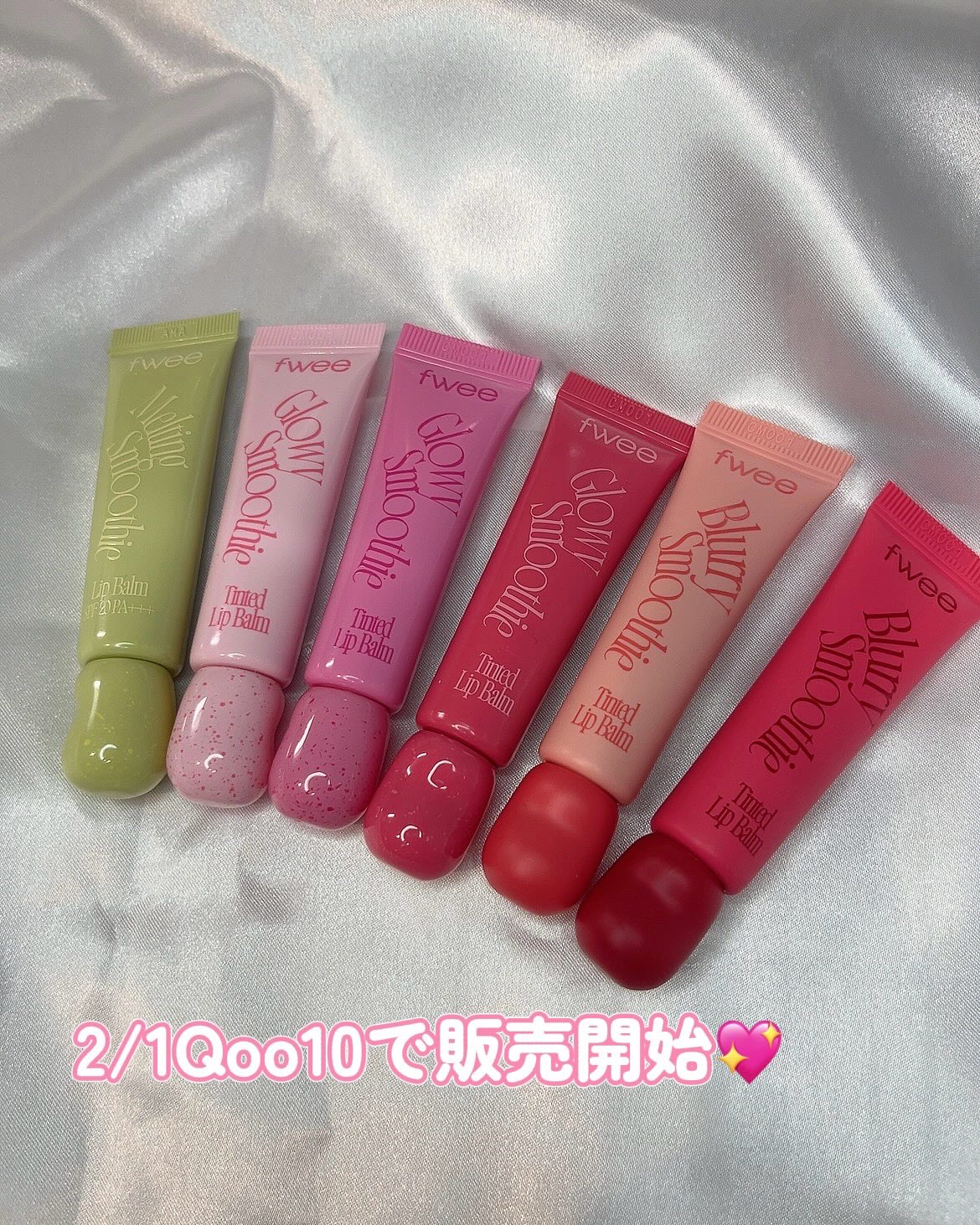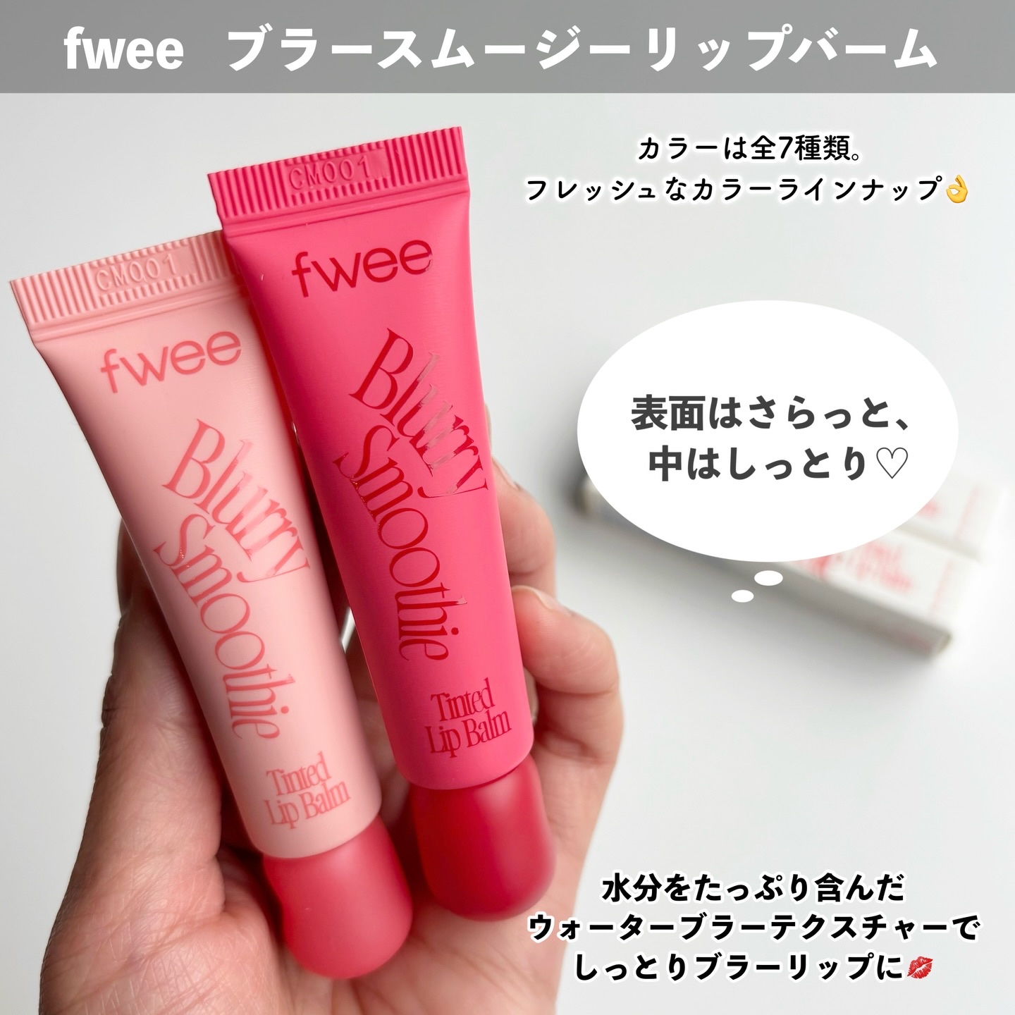 🍑🫐LIPBALM🥥🍉.✔︎fweeスムージーリップバーム2/1からQoo10で発売💖.3種全18色の豊富なラインナップ!ツヤからマットもケアまで叶えてくれる🌟.◽️グロウスムージーリップバーム"3dバリューミンググロス"のチューブタイプ。み...