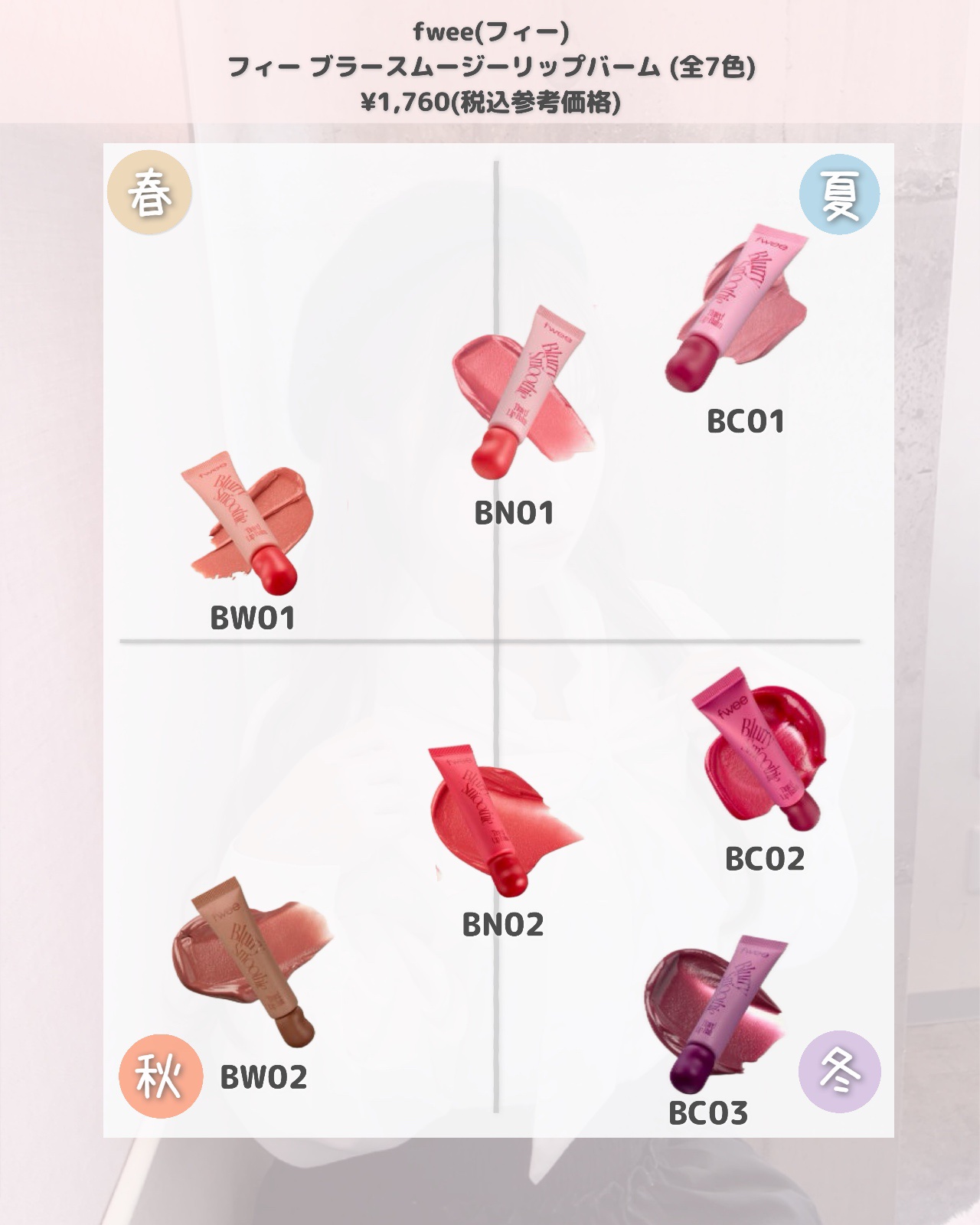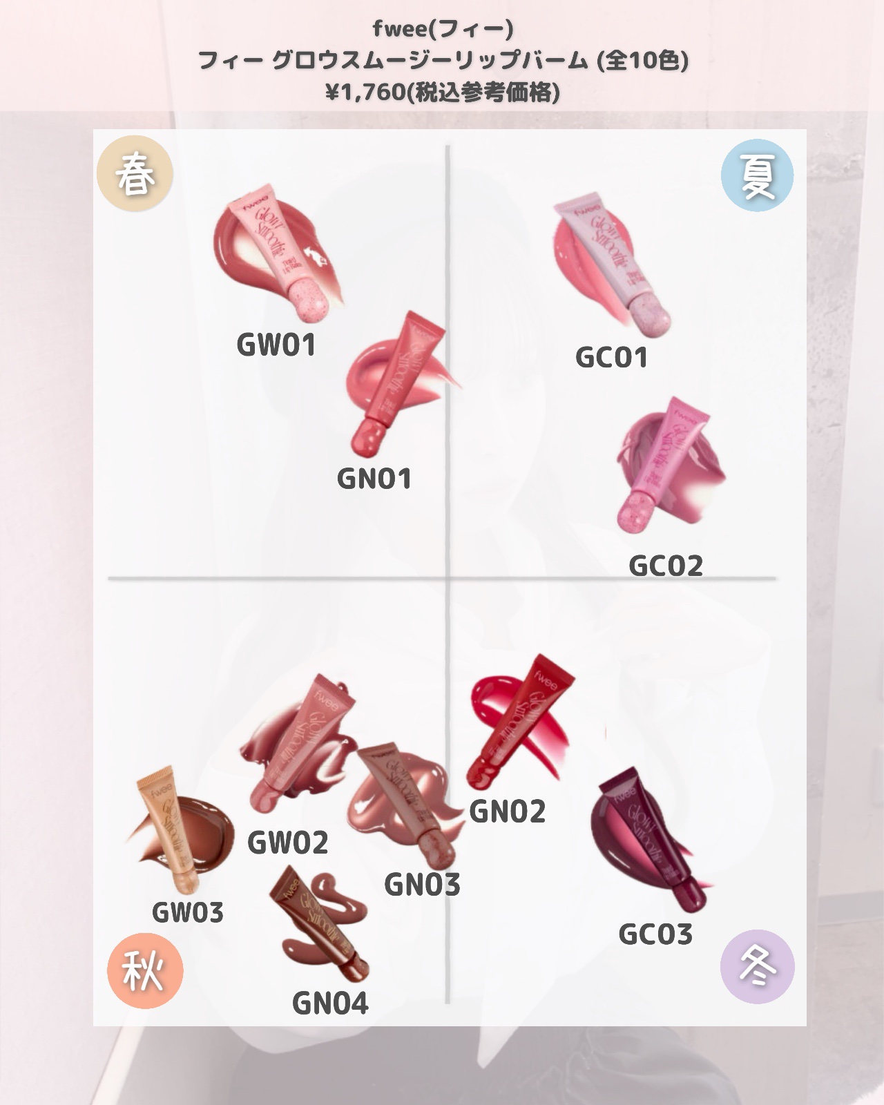 fweeの新作『スムージーリップバーム』💖グロウ10色、ブラー7色、メルティング1色展開で、カラーだけじゃなくテクスチャーまで選べちゃう❣️保湿成分もたっぷり配合されてて、バームタイプで保湿+メイクが叶うらしい🙌🏻春夏ライトの私は、グロウのG...