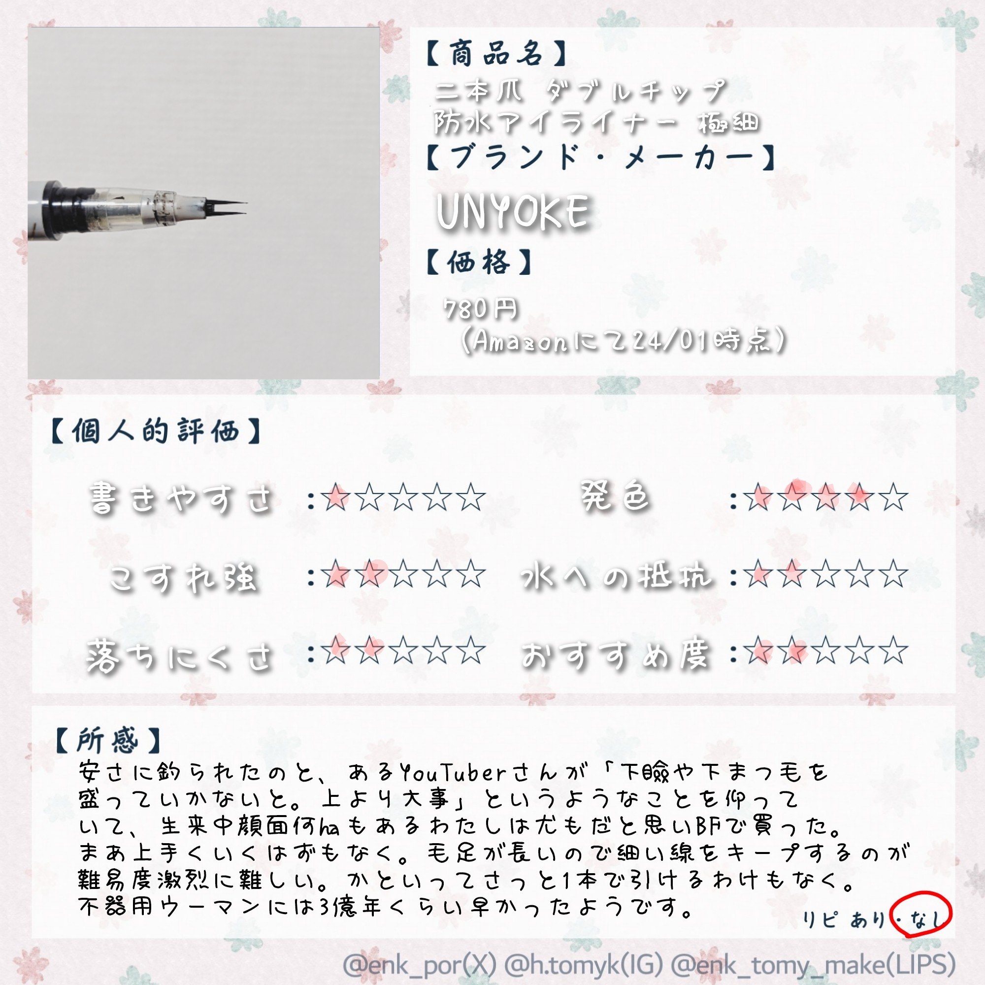 この中で唯一リピ有りなのがこちら。⚠️正直レビューなので好きな方はご注意ください+:-:+:-:+:-:+:-:+:-:+:-:+:-:+:-:+:-:+:-:+いつもご覧いただきありがとうございます🙇♀今回は手持ちのアイライナー比較✨敢えて大人気、わたしも大好きな「D-UP」のリキッドライナーは外してあります🙌果たして、全5種類のうちリピ確はどれになるのか🥹詳細は画像をそれぞれご覧ください🙇♀+:-:+:-:+:-:+:-:+:-:+:-:+:-:+:-:+:-:+:-:+ここまでご覧いただきありがとうございます😊皆様のいいねが励みになっております美容投稿ある方フォロバ100%✦フォロー、❤️、📎よろしくお願いします🙇+:-:+:-:+:-:+:-:+:-:+:-:+:-:+:-:+:-:+:-:+#アイライナー比較#手持ち比較#コスメ比較#正直レビュー#辛口レビュー