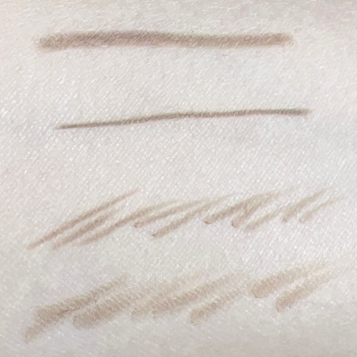 芯は柔らかめ。発色濃いめ。なめらかにスルスル描けます◎ 描いてすぐなら描き直し可能◎ 2分ほど経つと落ちにくくなります◎ 付属のブラシも柔らかめ。肌当たりも優しくチクチクしにくくて使いやすいと思います。ぼかしやすいです。 芯が柔らかめで描きやすいため、減りが少し早いかなと思いましたが許容範囲👍 アイブロウペンシルは描きやすさ重視なのでお気に入りになりました✨ 色が2色展開なので、他にも色んなお色味が増えたら嬉しいなと思います☺️