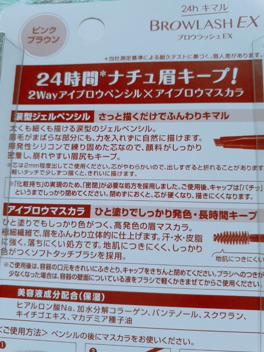 ❁ブロウラッシュEXウォーターストロングWブロウカラーピンクブラウンこちらは2wayタイプでジェルペンシルと眉マスカラがついています。ジェルペンシルの方はいたって普通のペンシルタイプでピンクがかった茶色でした。つけた感じはかなりベタッとしてい...